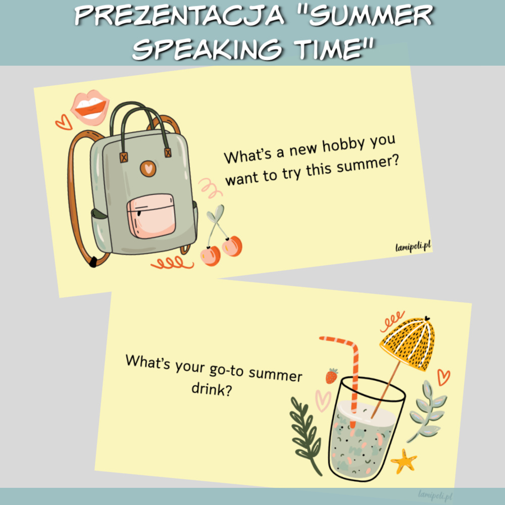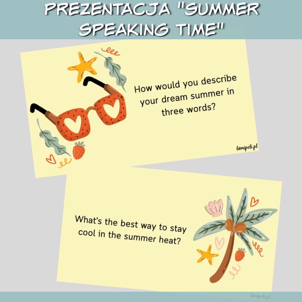 Prezentacja Summer Speaking Time to wyjątkowa prezentacja stworzona z myślą o zajęciach z młodzieżą i dorosłymi. Doskonale łączy naukę języka angielskiego z interesującymi tematami dotyczącymi lata. Dzięki różnorodnym pytaniom i estetycznym grafikom lekcje staną się ciekawsze i bardziej angażujące.