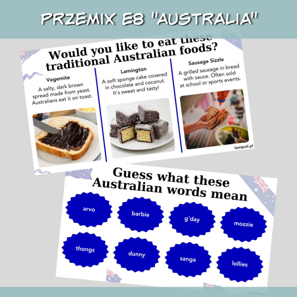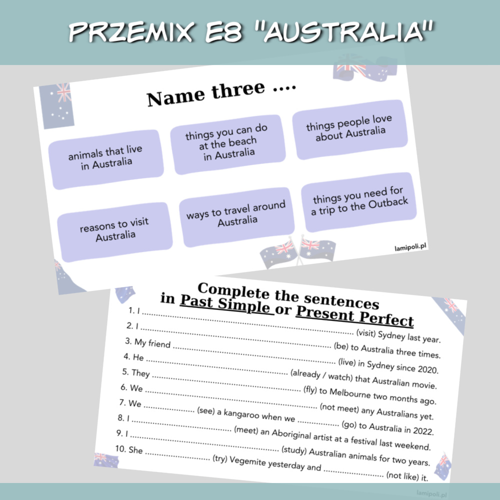 PrzeMIX E8 Australia to gotowy zestaw zadań w formie prezentacji PDF, stworzony z myślą o uczniach przygotowujących się do egzaminu ósmoklasisty. Prezentacja idealnie sprawdzi się również podczas zajęć z młodzieżą ze szkół średnich i z dorosłymi. Temat przewodni – Australia – pozwala nie tylko utrwalić zagadnienia egzaminacyjne, ale również poznać ciekawostki kulturowe i rozwinąć umiejętności językowe w angażujący sposób.