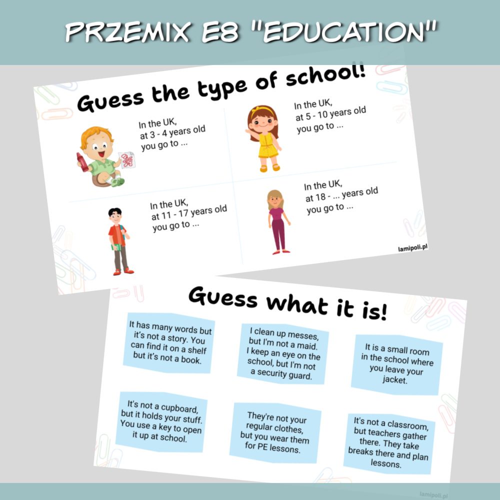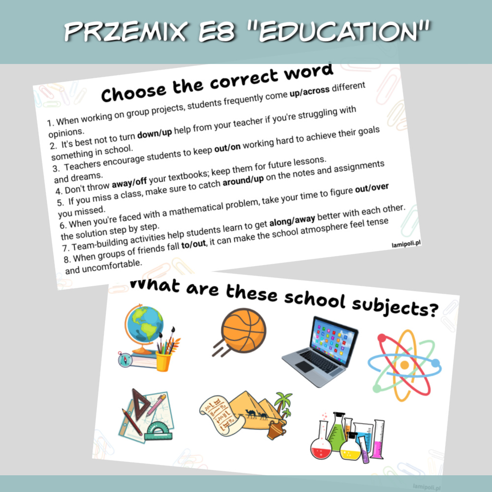 PrzeMIX E8 Education to zbiór zadań w formie prezentacji na zajęcia z uczniami przygotowującymi się do egzaminu ósmoklasisty. Prezentacja sprawdzi się również jako urozmaicenie zajęć z uczniami ze szkoły średniej oraz z dorosłymi. W zestawie PrzeMIX E8 Education znajdziemy zadania sprawdzające znajomość słownictwa, zwrotów oraz gramatyki w języku angielskim, a także zadania na speaking. Wszystko to w temacie edukacji.