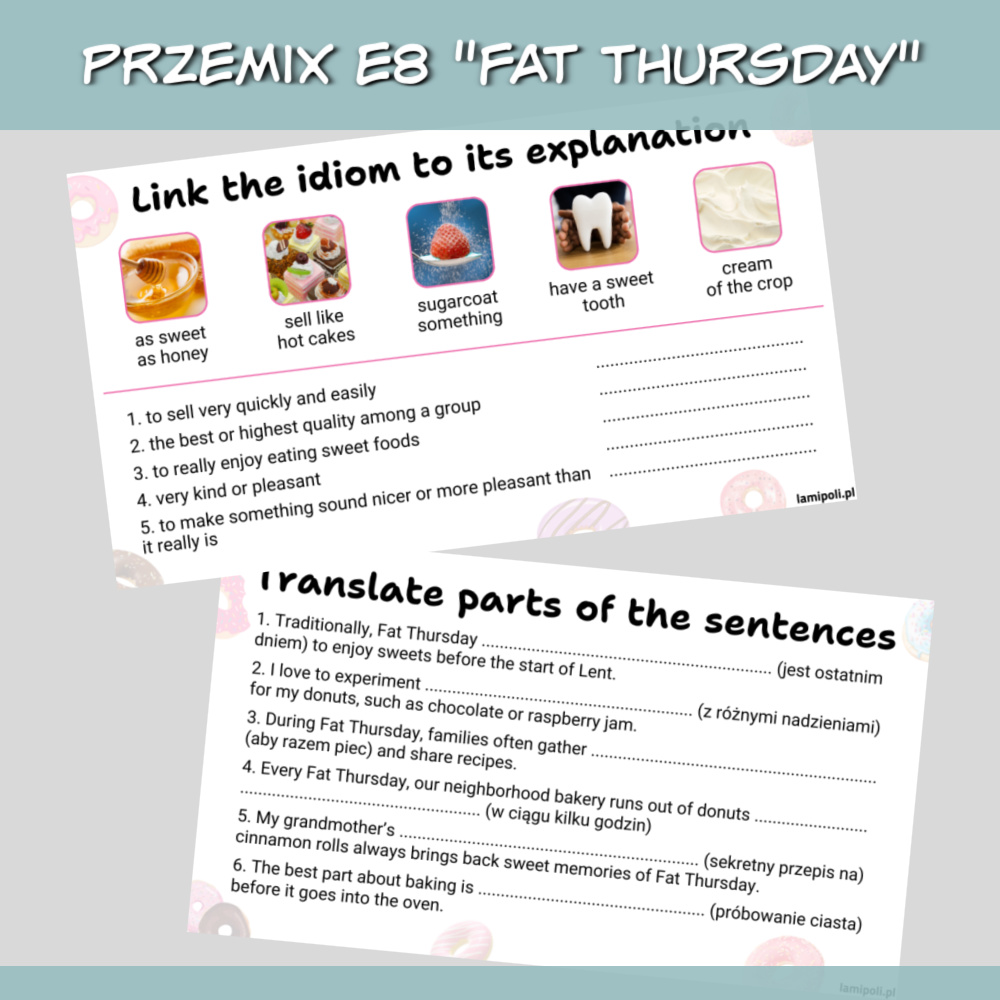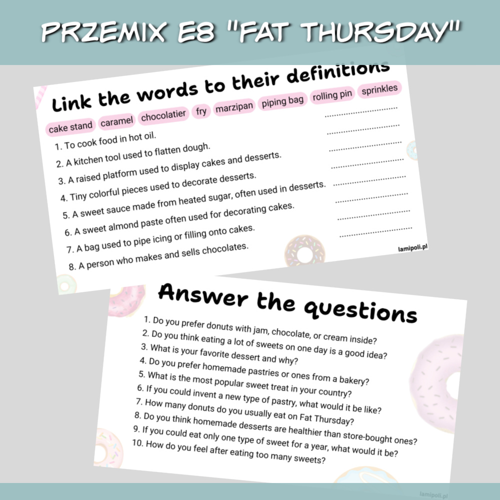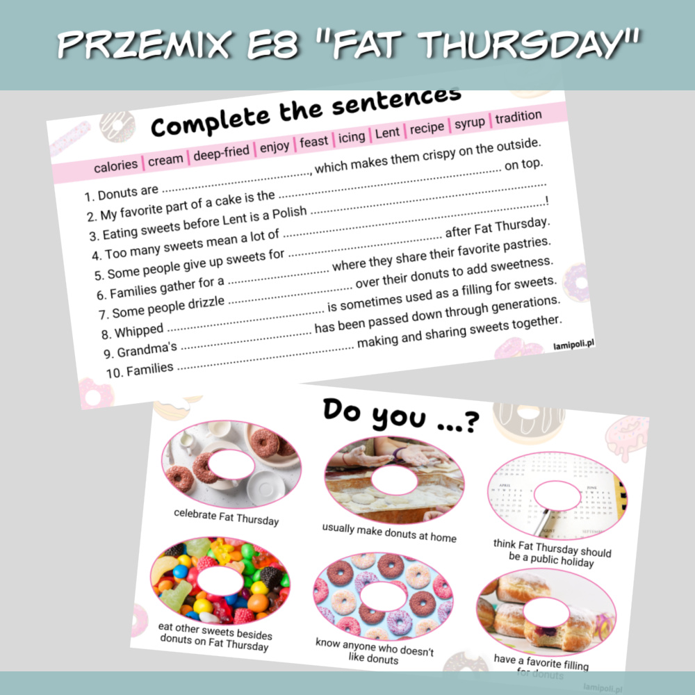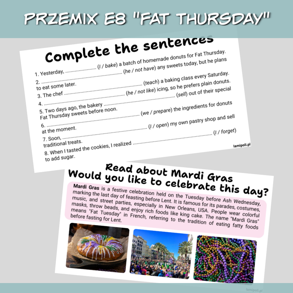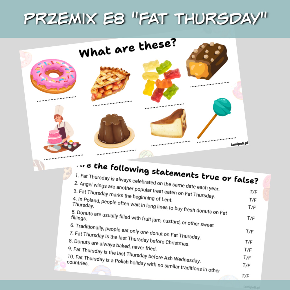 PrzeMIX E8 Fat Thursday to zbiór gotowych pomysłów i zadań na zajęcia języka angielskiego związane z Tłustym Czwartkiem. Polecamy go zwłaszcza w klasie 7 i 8 szkoły podstawowej, gdy uczniowie przygotowują się do egzaminu ósmoklasisty, ale sprawdzi się również jako powtórka materiału w szkole średniej.