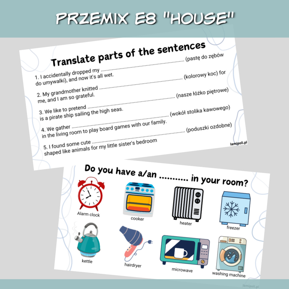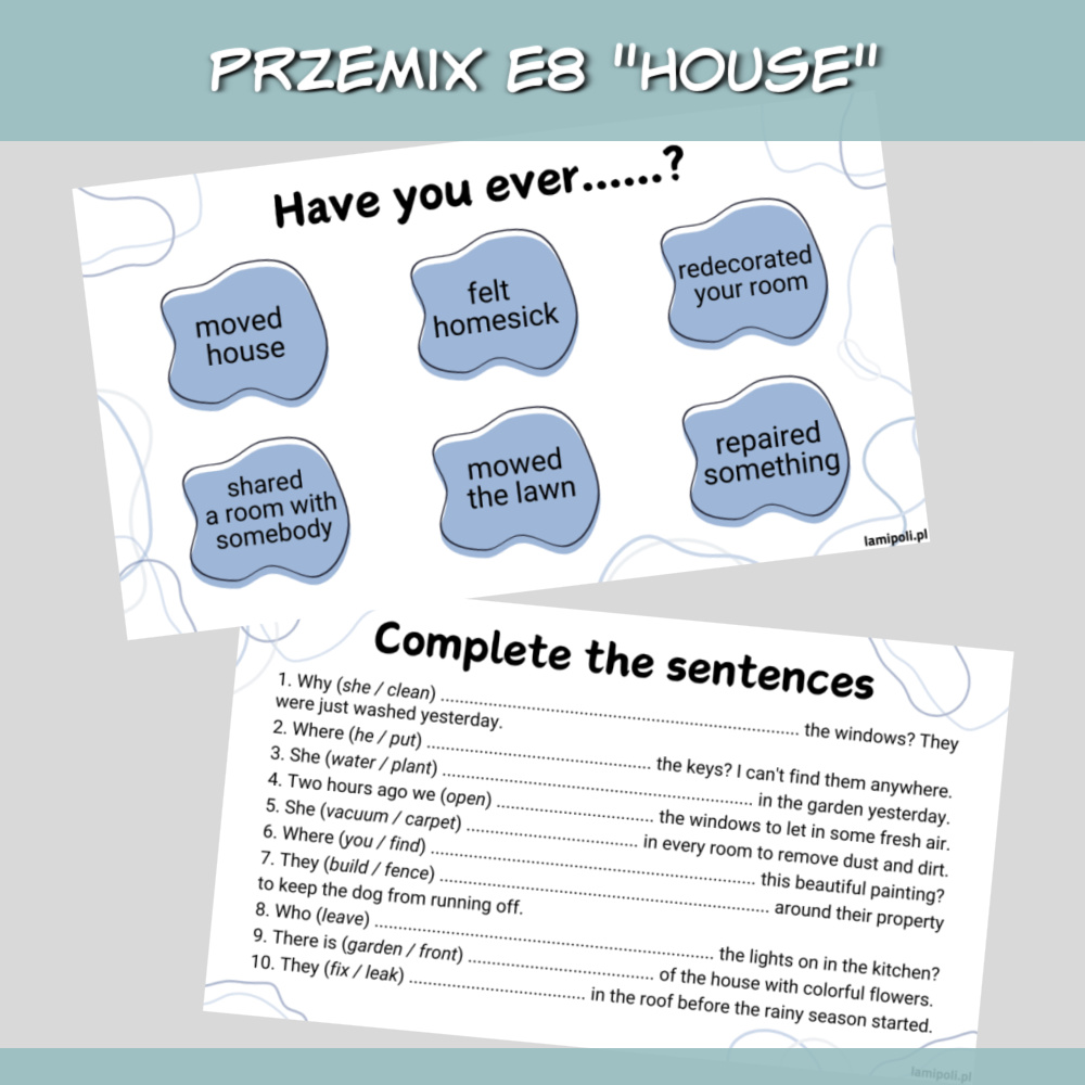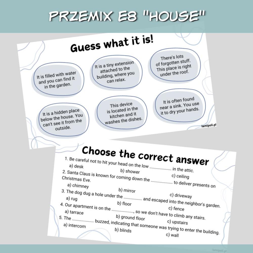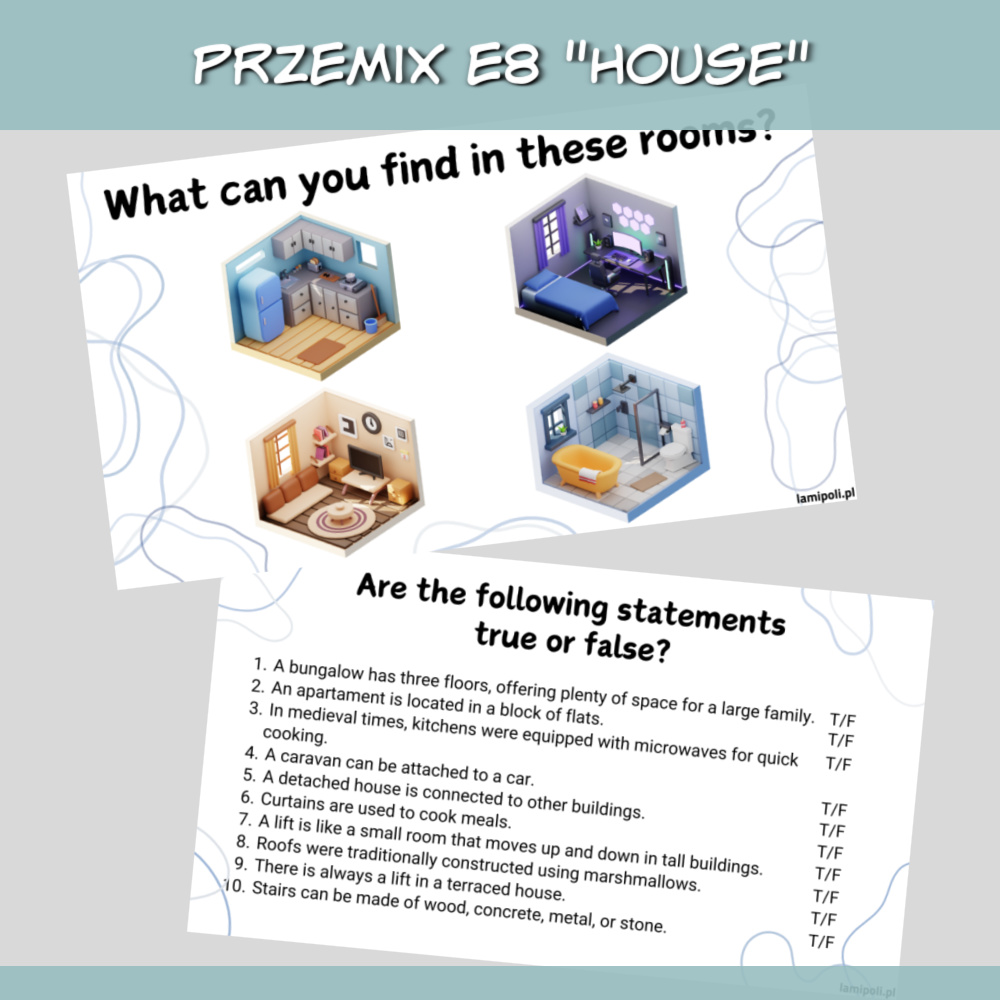 PrzeMIX E8 House to zbiór zadań w formie prezentacji na zajęcia z uczniami przygotowującymi się do egzaminu ósmoklasisty. Prezentacja sprawdzi się również jako urozmaicenie zajęć z uczniami ze szkoły średniej oraz z dorosłymi. W zestawie znajdziemy zadania sprawdzające znajomość słownictwa, zwrotów oraz gramatyki w języku angielskim, a także zadania na speaking. Wszystko to w temacie domu.