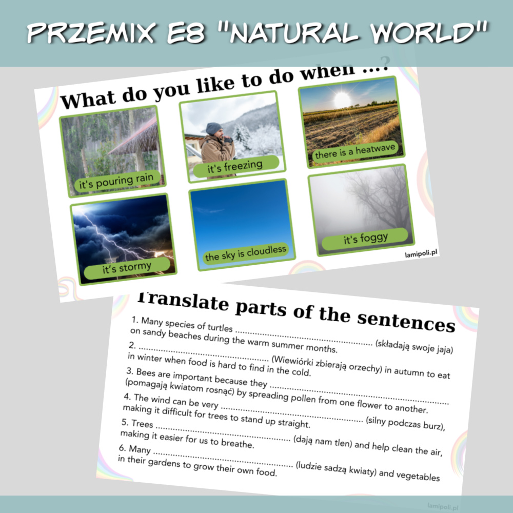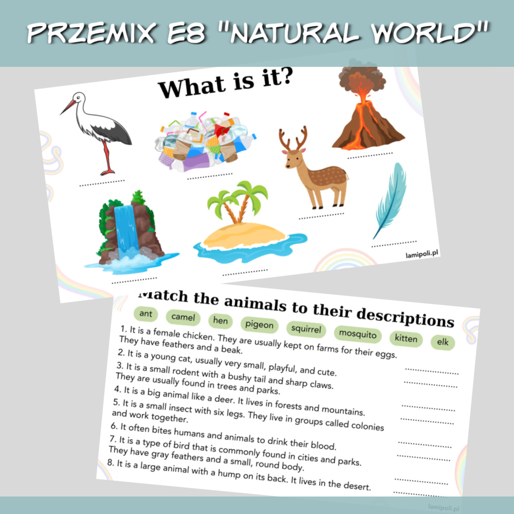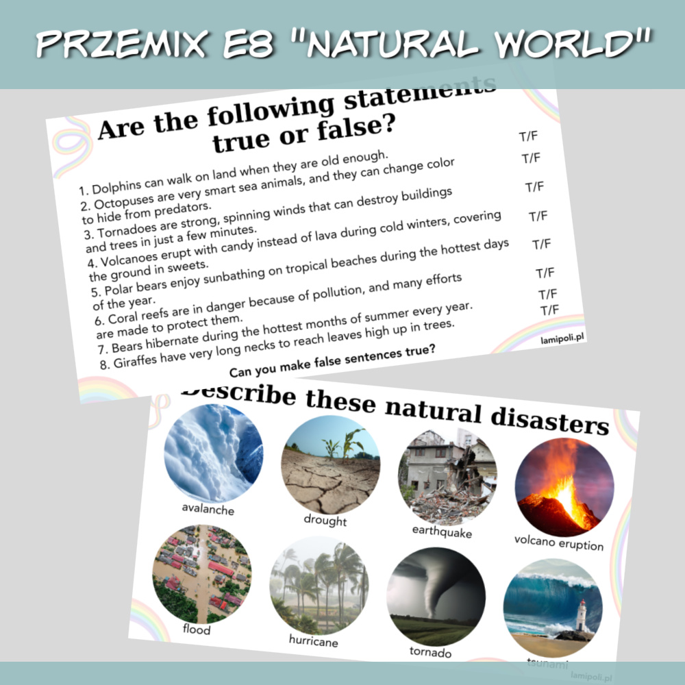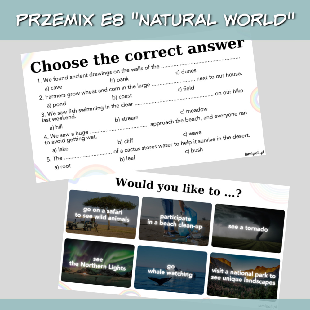 PrzeMIX E8 Natural world to zbiór zadań w formie prezentacji na zajęcia z uczniami przygotowującymi się do egzaminu ósmoklasisty. Prezentacja sprawdzi się również jako urozmaicenie zajęć z uczniami ze szkoły średniej oraz z dorosłymi. W zestawie PrzeMIX E8 Natural world znajdziemy zadania sprawdzające znajomość słownictwa, zwrotów oraz gramatyki w języku angielskim, a także zadania na speaking. Wszystko to w temacie środowiska naturalnego.