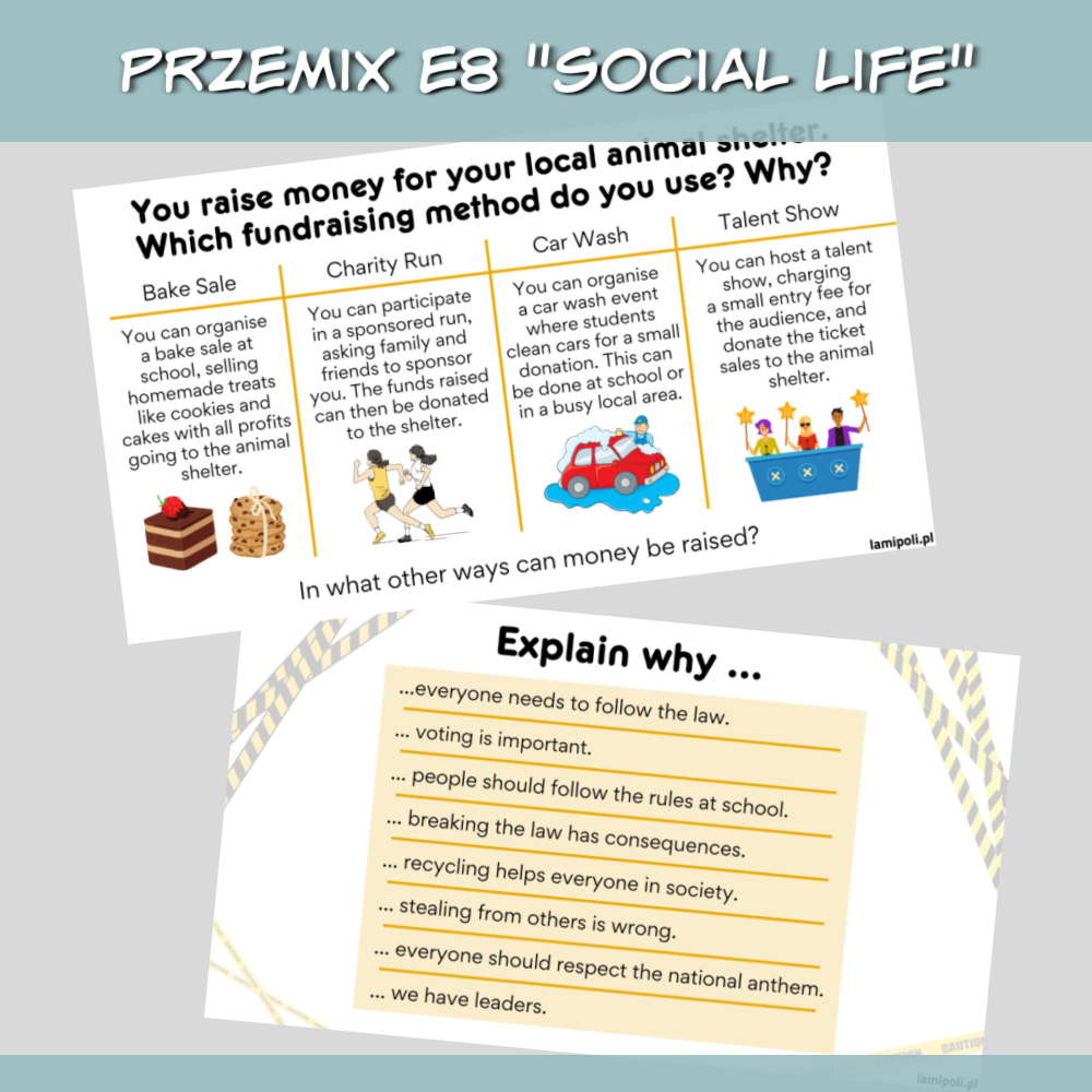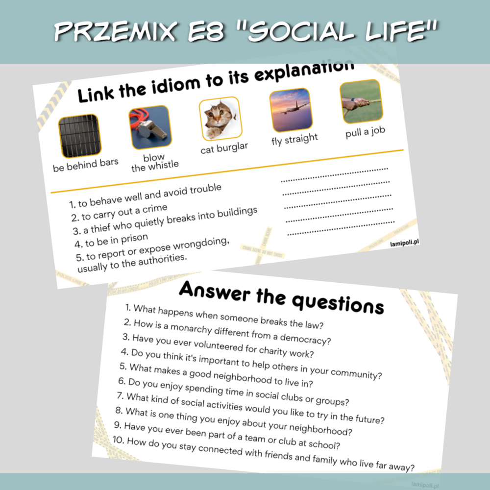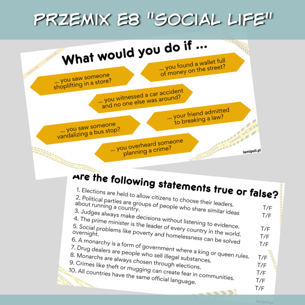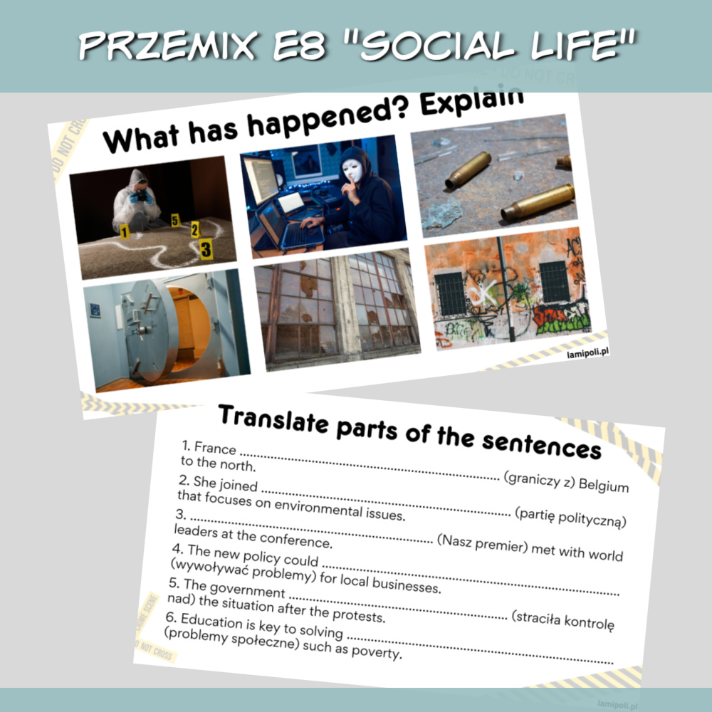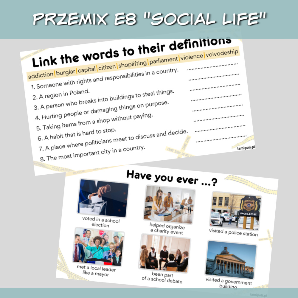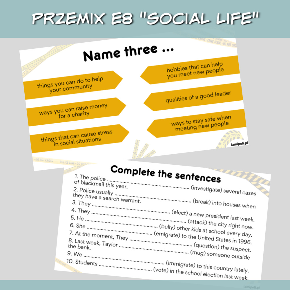 Zestaw PrzeMIX E8 Social life z zadaniami na lekcję angielskiego to doskonałe materiały dla starszych klas podstawówki oraz uczniów szkoły średniej. Materiały są na poziomie a2/b1, ale z powodzeniem sprawdzą się też jako powtórka na wyższych poziomach.