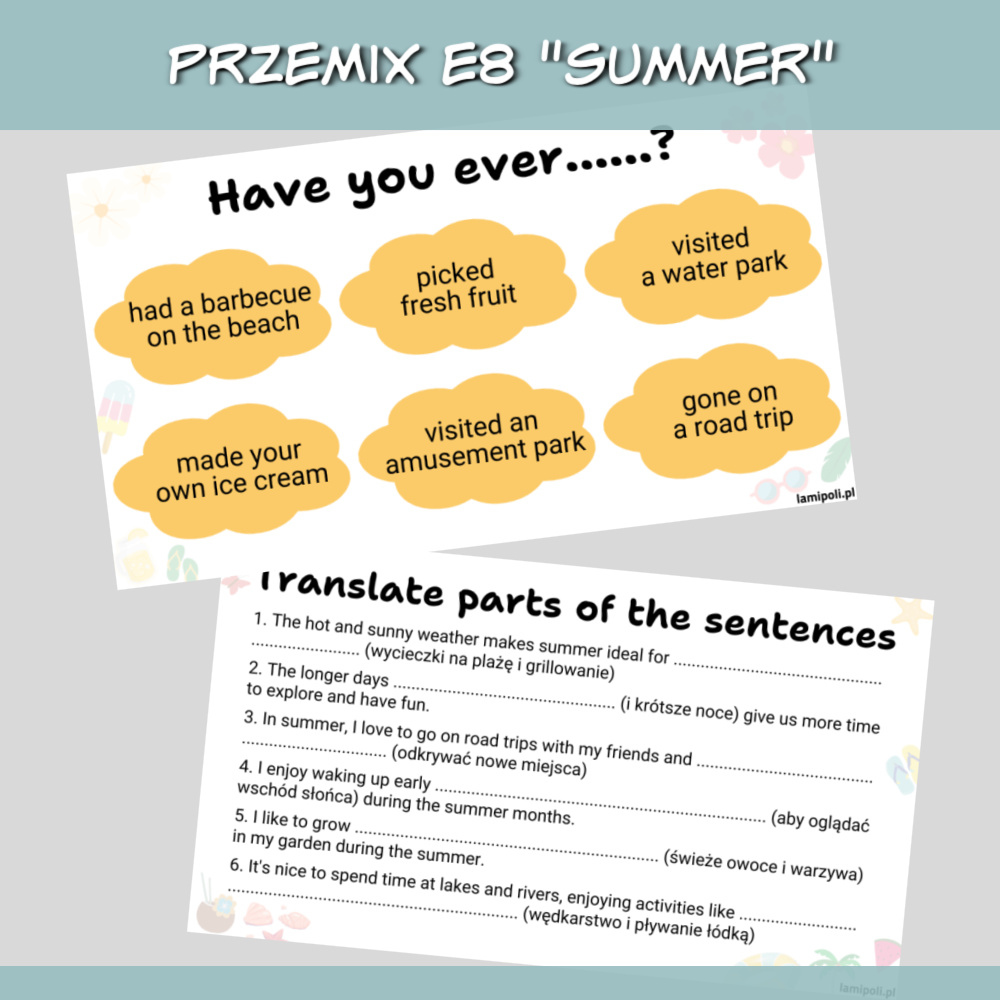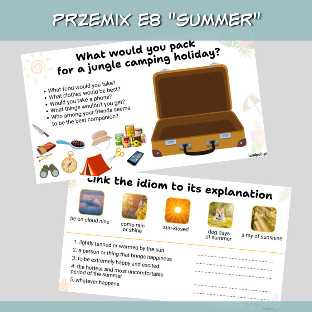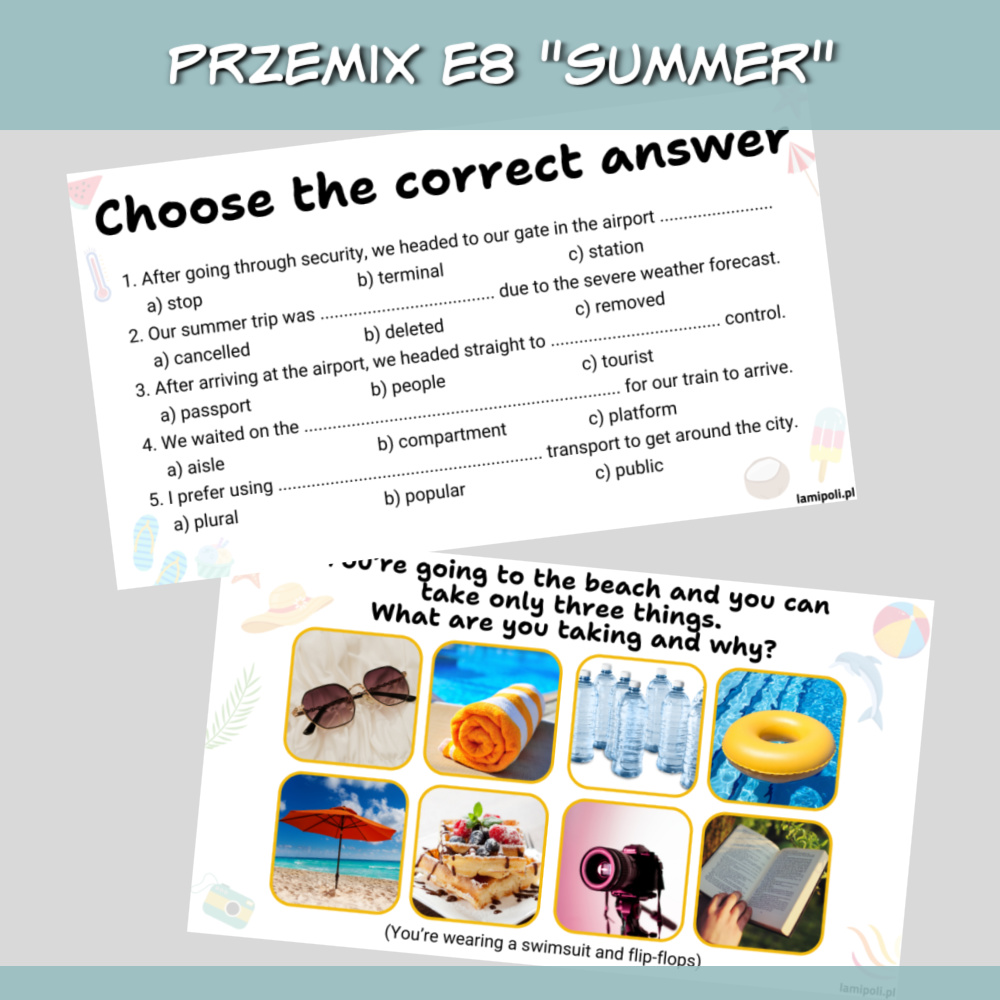 PrzeMIX E8 Summer to zbiór zadań w formie prezentacji na zajęcia z uczniami przygotowującymi się do egzaminu ósmoklasisty. Prezentacja sprawdzi się również jako urozmaicenie zajęć z uczniami ze szkoły średniej oraz z dorosłymi. W zestawie PrzeMIX E8 Summer znajdziemy zadania sprawdzające znajomość słownictwa, zwrotów oraz gramatyki w języku angielskim, a także zadania na speaking. Wszystko to w temacie lata.