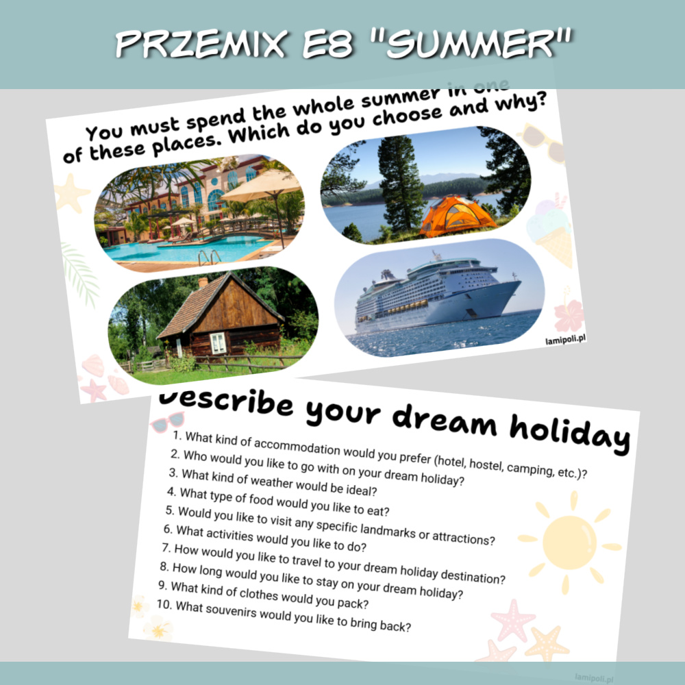 PrzeMIX E8 Summer online to zbiór zadań w formie prezentacji na zajęcia z uczniami przygotowującymi się do egzaminu ósmoklasisty. Prezentacja sprawdzi się również jako urozmaicenie zajęć z uczniami ze szkoły średniej oraz z dorosłymi. W zestawie PrzeMIX E8 Summer online znajdziemy zadania sprawdzające znajomość słownictwa, zwrotów oraz gramatyki w języku angielskim, a także zadania na speaking. Wszystko to w temacie lata.