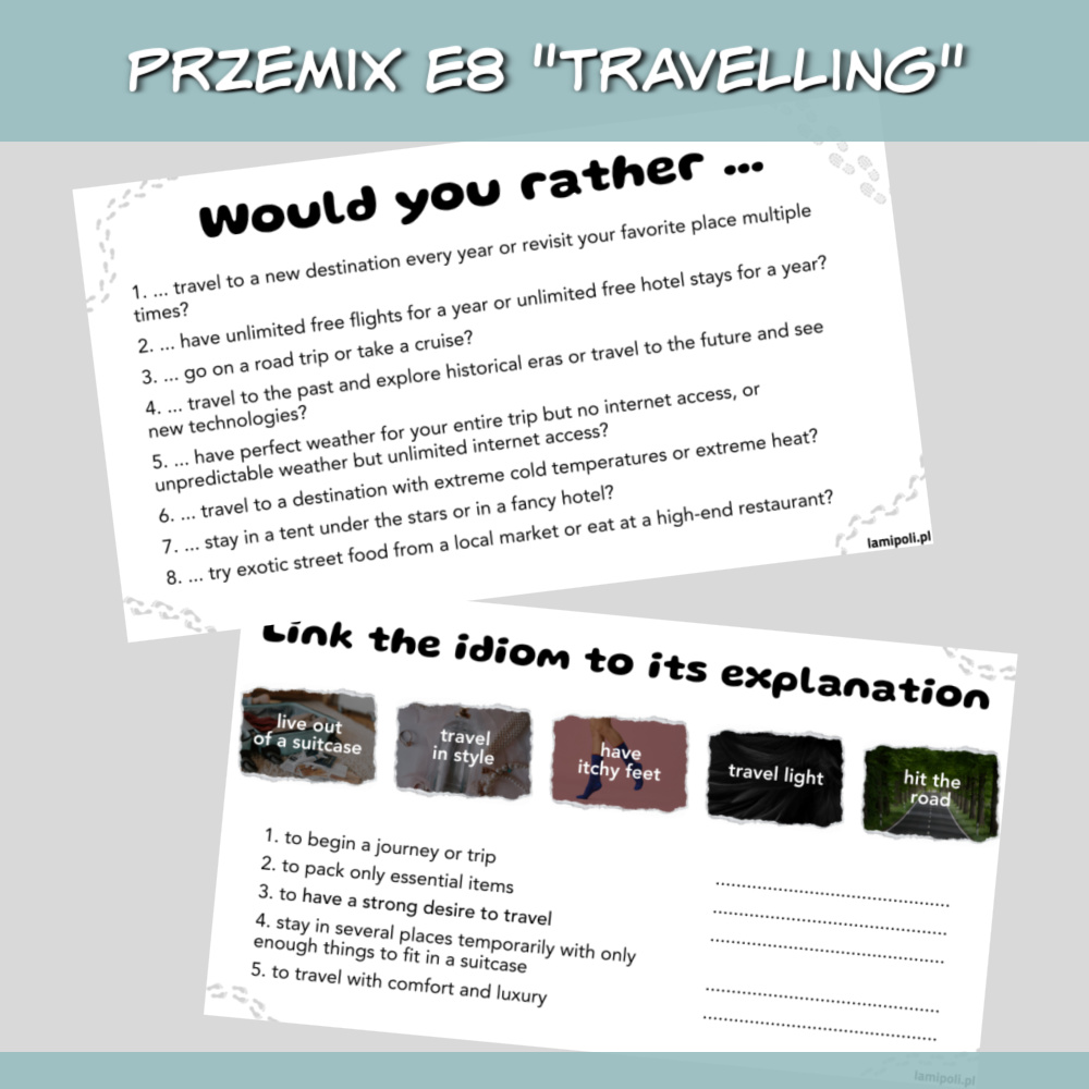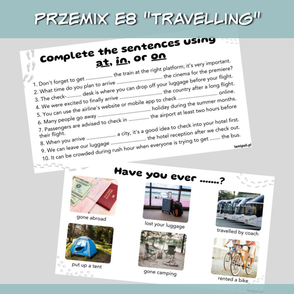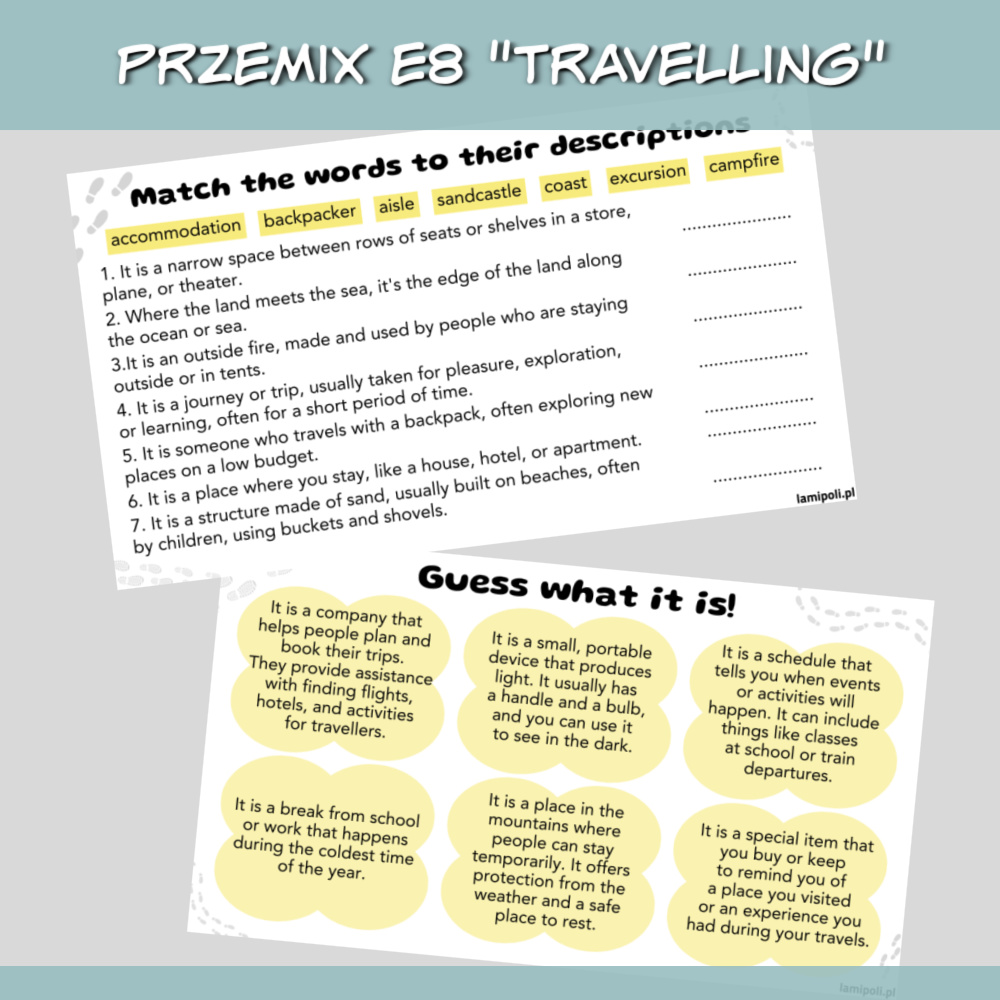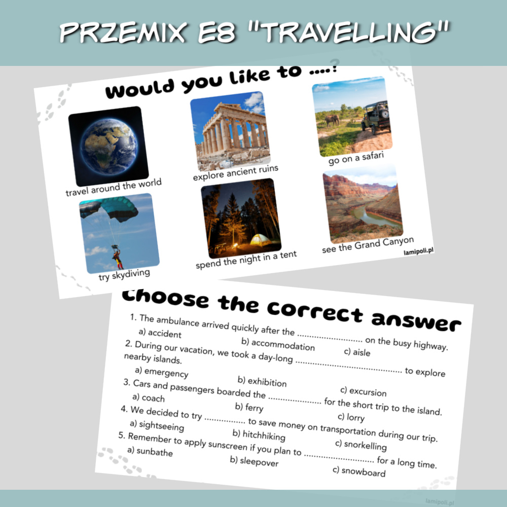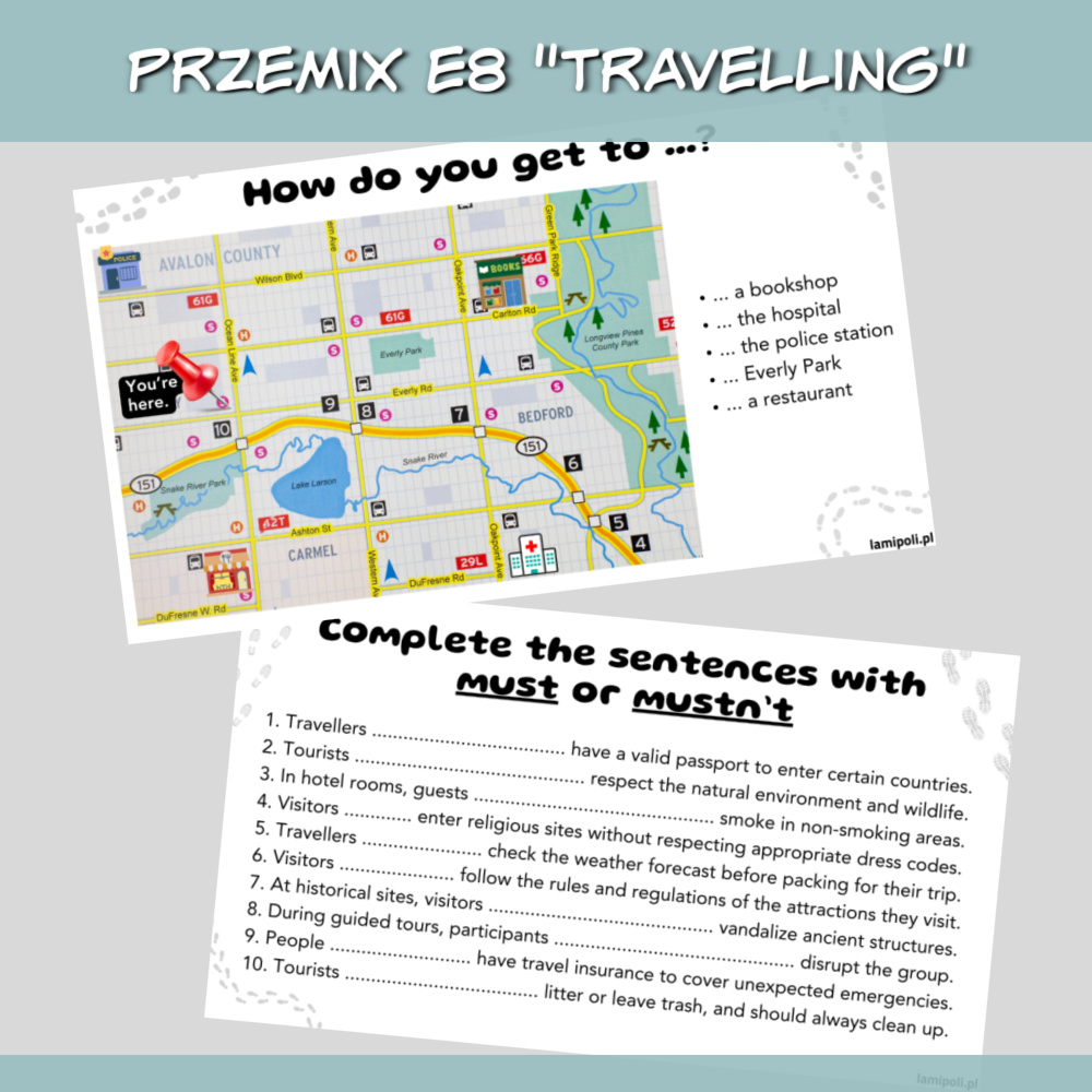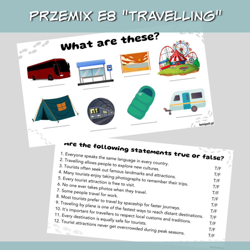 PrzeMIX E8 Travelling to zbiór zadań w formie prezentacji na zajęcia z uczniami przygotowującymi się do egzaminu ósmoklasisty. Prezentacja sprawdzi się również jako urozmaicenie zajęć z uczniami ze szkoły średniej oraz z dorosłymi. W zestawie znajdziemy zadania sprawdzające znajomość słownictwa, zwrotów oraz gramatyki w języku angielskim, a także zadania na speaking. Wszystko to w temacie podróżowania w ramach pakietu PrzeMIX E8 Travelling.