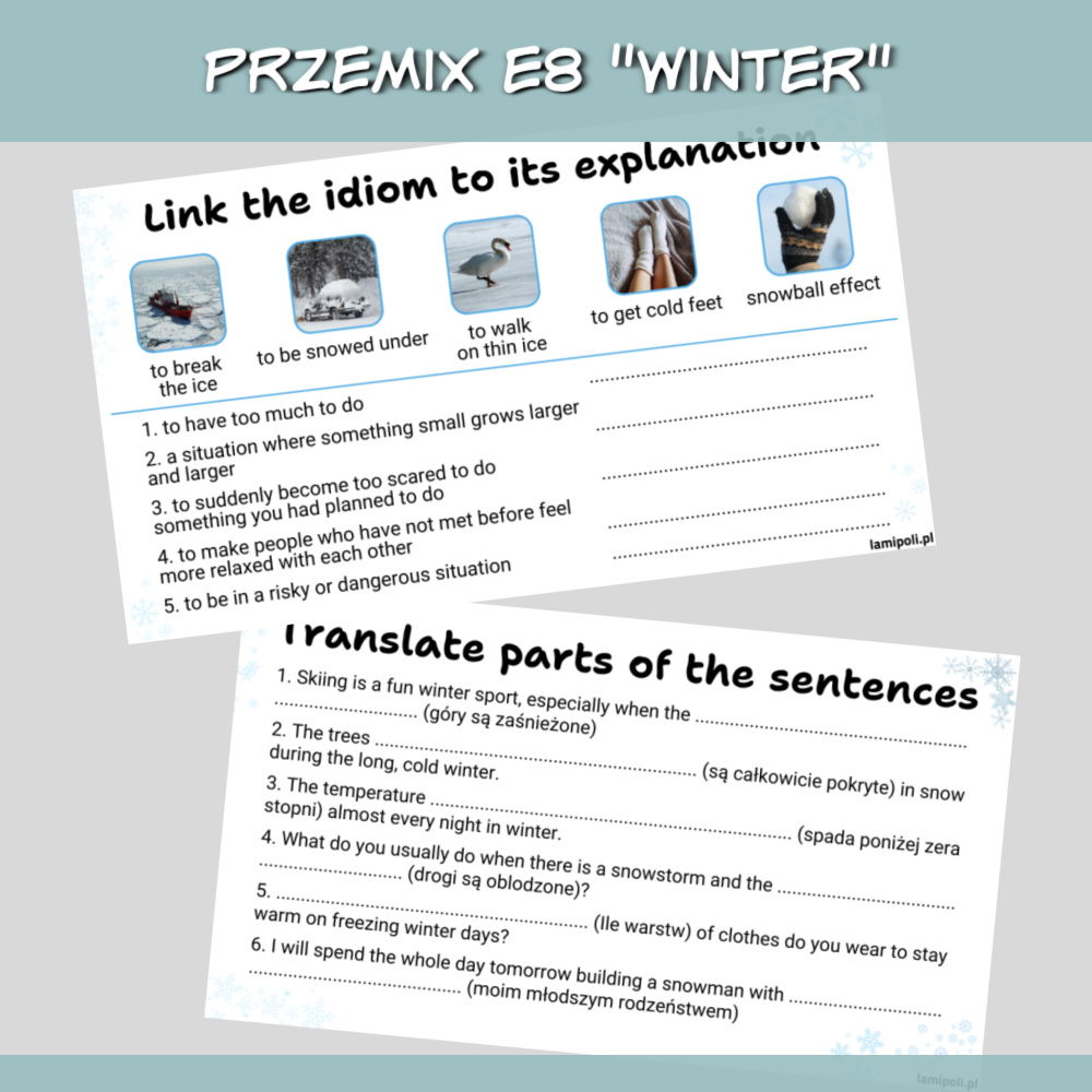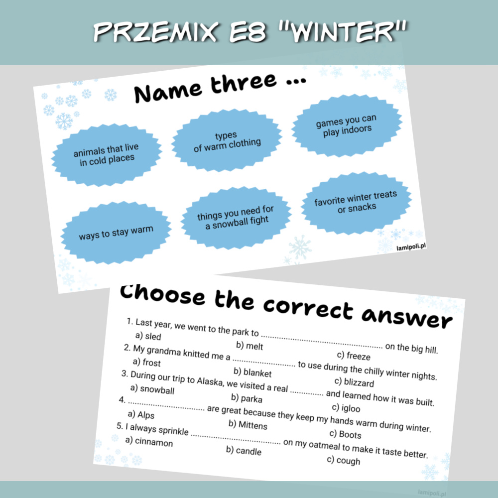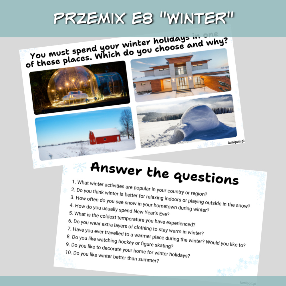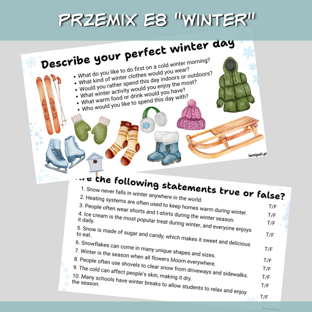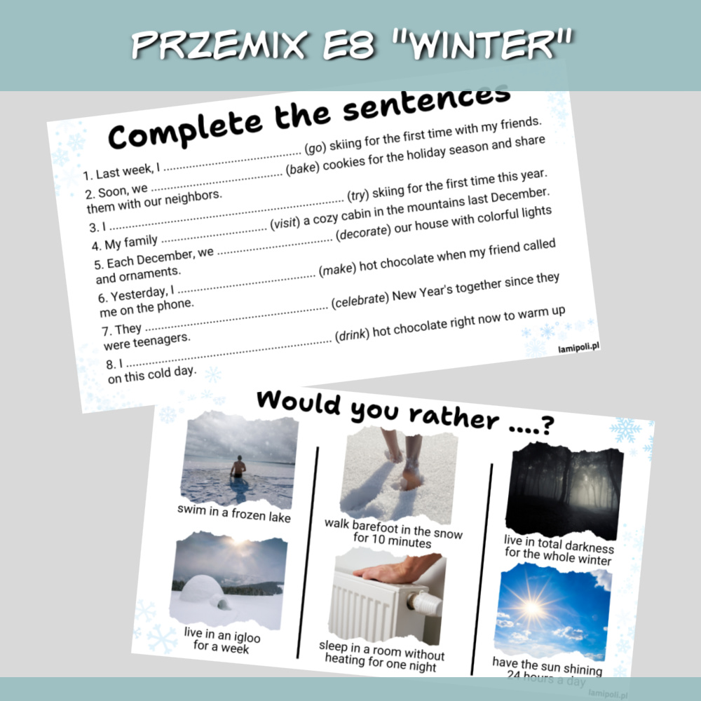 PrzeMIX E8 Winter to zbiór zadań w formie prezentacji na zajęcia z uczniami przygotowującymi się do egzaminu ósmoklasisty. Prezentacja sprawdzi się również jako urozmaicenie zajęć z uczniami ze szkoły średniej oraz z dorosłymi. W zestawie PrzeMIX E8 Winter znajdziemy zadania sprawdzające znajomość słownictwa, zwrotów oraz gramatyki w języku angielskim, a także zadania na speaking. Wszystko to w temacie zimy.