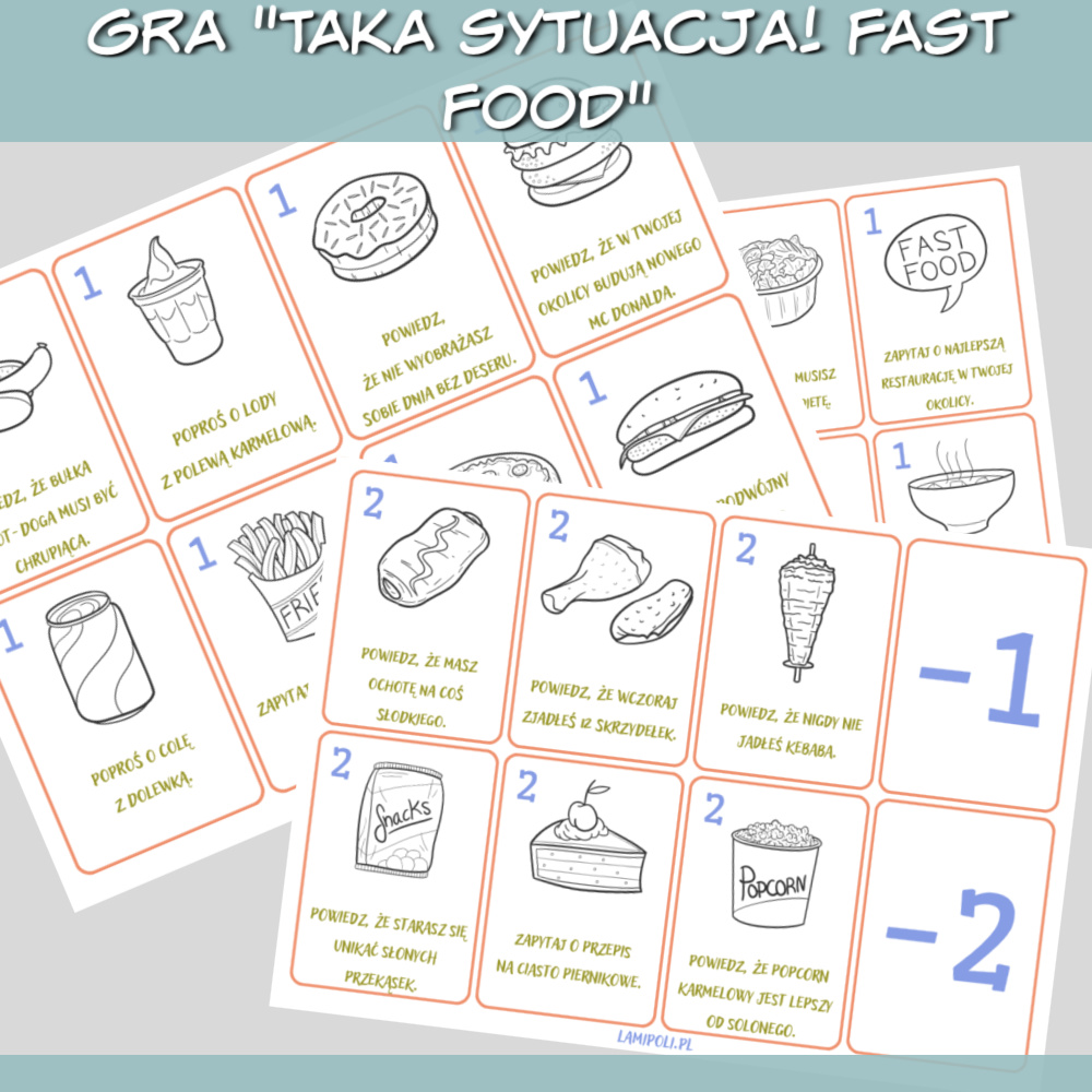 Taka sytuacja! Fast Food gra do druku zawiera różne sytuacje do odegrania, takie jak: Poproś o lody z polewą karmelową. Zapytaj o cenę dużych frytek. Poproś o podwójny ser do twojego cheeseburgera. Karty są w języku polskim, więc grę można wykorzystać do nauki każdego języka obcego. Dodatkowo gra jest dostępna w dwóch wersjach, kolorowej i czarno-białej. Zdobywaj punkty odgrywając różne sytuacje i unikaj kart z ujemnymi punktami. Osoba, której uda się zdobyć najwięcej punktów, wygrywa! Gra Taka sytuacja! Fast Food sprawdzi się najlepiej na zajęciach indywidualnych i w małych grupach, karty można również wykorzystać jako rozgrzewkę na początku zajęć.