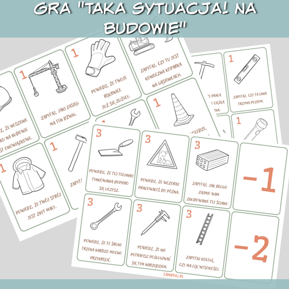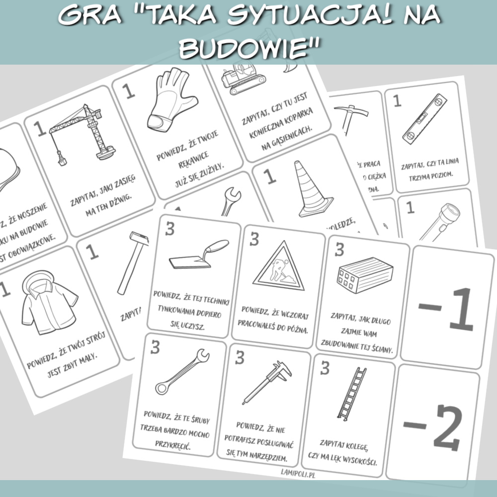 Taka sytuacja! Na budowie gra do druku zawiera różne sytuacje do odegrania, takie jak: Zapytaj, gdzie jest skrzynka z narzędziami. Powiedz, że twoje rękawice już się zużyły. Zamów betoniarkę na 6 rano. Karty są w języku polskim, więc grę można wykorzystać do nauki każdego języka obcego. Dodatkowo gra jest dostępna w dwóch wersjach, kolorowej i czarno-białej. Zdobywaj punkty odgrywając różne sytuacje i unikaj kart z ujemnymi punktami. Osoba, której uda się zdobyć najwięcej punktów, wygrywa! Gra Taka sytuacja! Na budowie sprawdzi się najlepiej na zajęciach indywidualnych i w małych grupach, karty można również wykorzystać jako rozgrzewkę na początku zajęć.