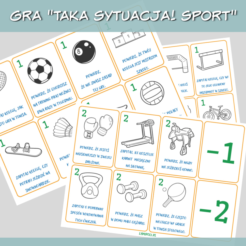 Taka sytuacja! Sport gra do druku zawiera różne sytuacje do odegrania, takie jak: Powiedz, że nie znasz zasad tej gry. Zapytaj o poprawny sposób wykonywania tych ćwiczeń. Powiedz, że masz w domu małe ciężarki. Karty są w języku polskim, więc grę można wykorzystać do nauki każdego języka obcego. Dodatkowo gra jest dostępna w dwóch wersjach, kolorowej i czarno-białej. Zdobywaj punkty odgrywając różne sytuacje i unikaj kart z ujemnymi punktami. Osoba, której uda się zdobyć najwięcej punktów, wygrywa! Gra Taka sytuacja! Sport sprawdzi się najlepiej na zajęciach indywidualnych i w małych grupach, karty można również wykorzystać jako rozgrzewkę na początku zajęć.