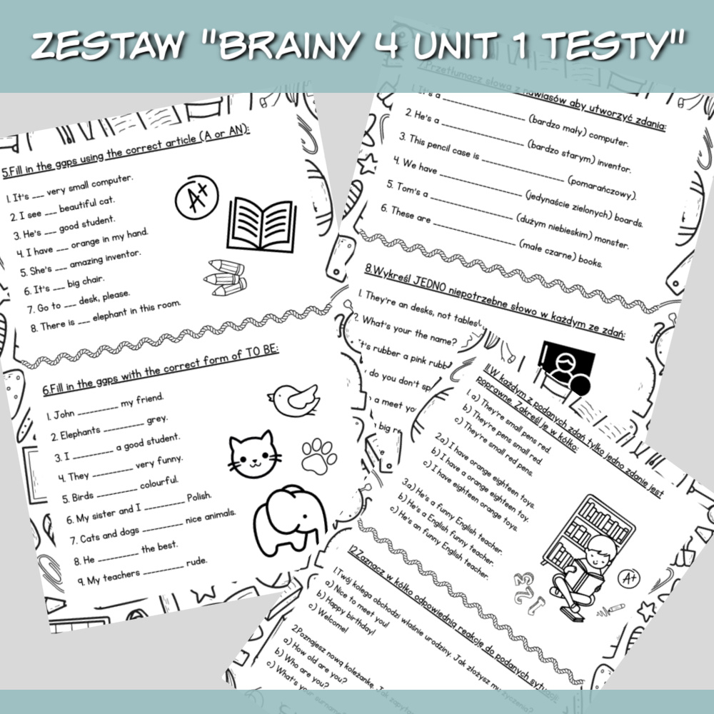 Zestaw Brainy 4 Unit 1 Testy to komplet materiałów w formacie PDF przeznaczony do powtórki i sprawdzenia wiedzy z danego rozdziału podręcznika Brainy 4. W pliku znajdują się dwie wersje testów, jedna z poleceniami w języku angielskim, druga z poleceniami po polsku, dzięki czemu możesz dopasować materiał do poziomu uczniów.
