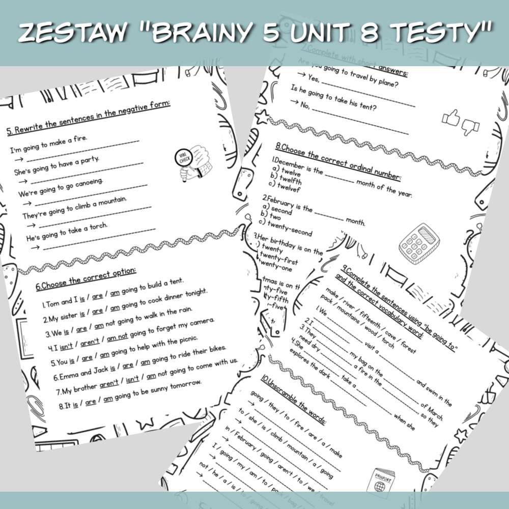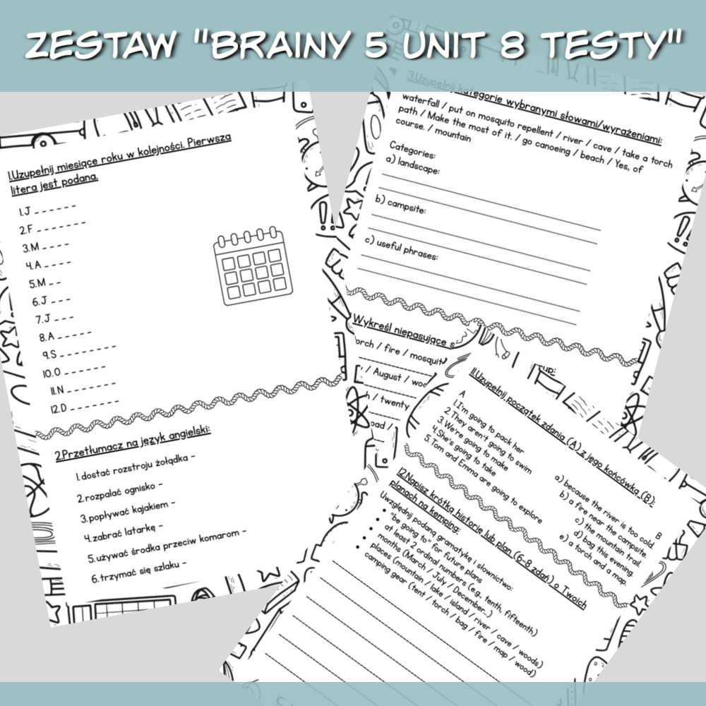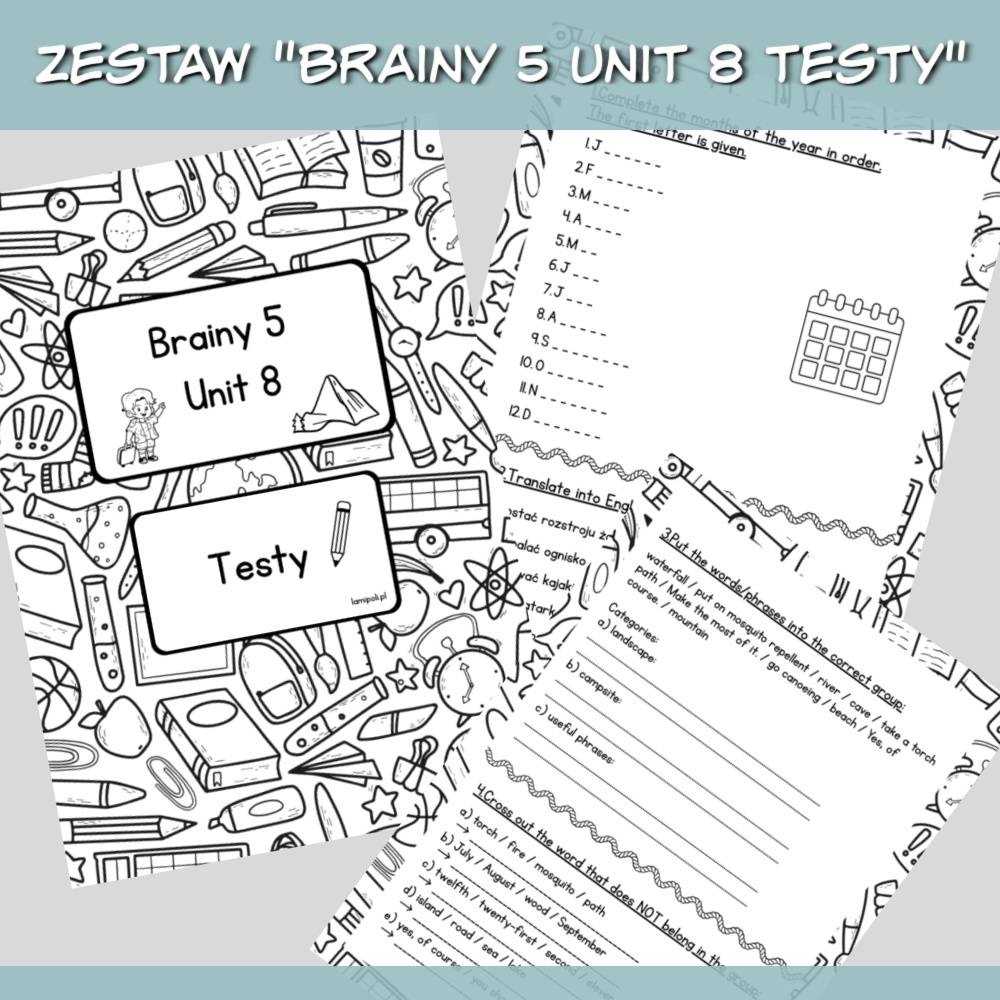 Zestaw Brainy 5 Unit 8 Testy to komplet materiałów w formacie PDF przeznaczony do powtórki i sprawdzenia wiedzy z danego rozdziału podręcznika Brainy 5. W pliku znajdują się dwie wersje testów, jedna z poleceniami w języku angielskim, druga z poleceniami po polsku, dzięki czemu możesz dopasować materiał do poziomu uczniów.