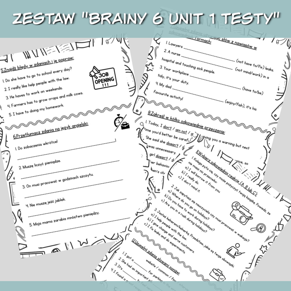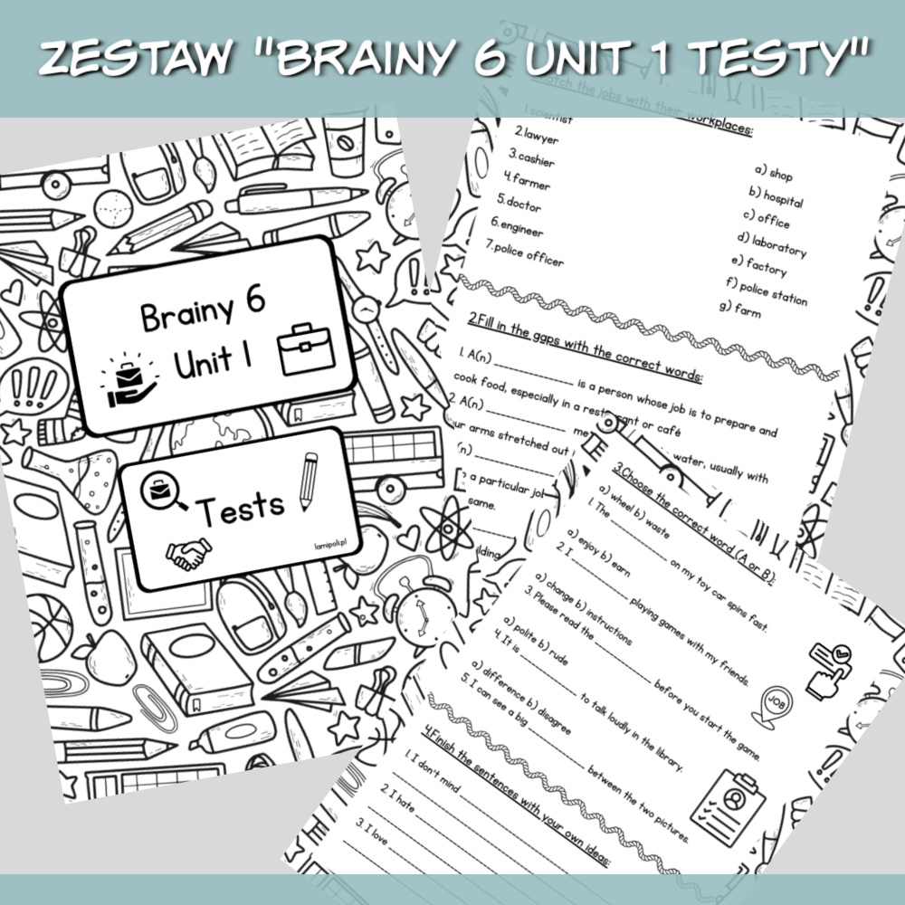Zestaw Brainy 6 Unit 1 Testy to komplet materiałów w formacie PDF przeznaczony do powtórki i sprawdzenia wiedzy z danego rozdziału podręcznika Brainy 6. W pliku znajdują się dwie wersje testów, jedna z poleceniami w języku angielskim, druga z poleceniami po polsku, dzięki czemu możesz dopasować materiał do poziomu uczniów.
