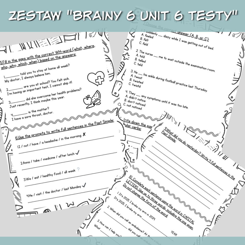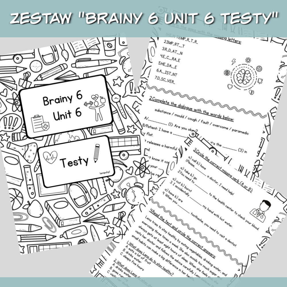 Zestaw Brainy 6 Unit 6 Testy to komplet materiałów w formacie PDF przeznaczony do powtórki i sprawdzenia wiedzy z danego rozdziału podręcznika Brainy 6. W pliku znajdują się dwie wersje testów, jedna z poleceniami w języku angielskim, druga z poleceniami po polsku, dzięki czemu możesz dopasować materiał do poziomu uczniów.