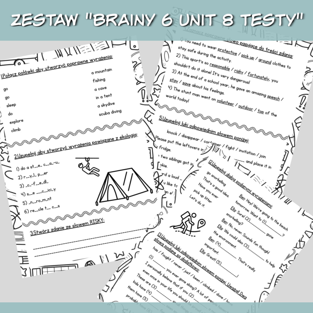 Zestaw Brainy 6 Unit 8 Testy to komplet materiałów w formacie PDF przeznaczony do powtórki i sprawdzenia wiedzy z danego rozdziału podręcznika Brainy 6. W pliku znajdują się dwie wersje testów, jedna z poleceniami w języku angielskim, druga z poleceniami po polsku, dzięki czemu możesz dopasować materiał do poziomu uczniów.