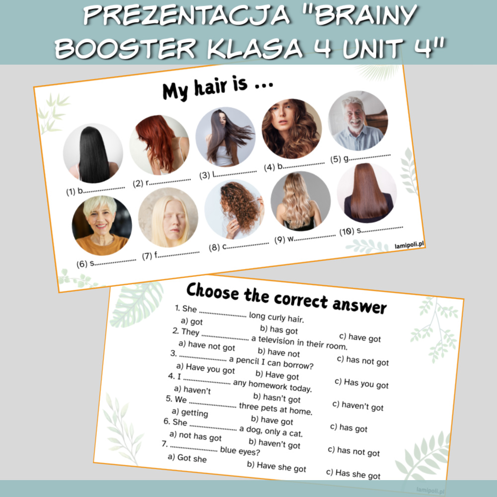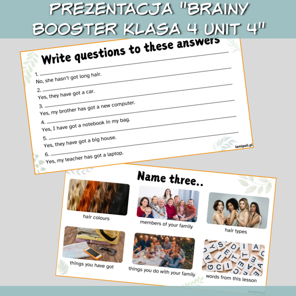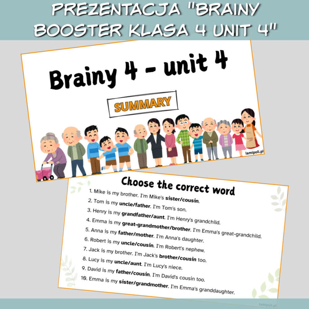 prezentację w formacie PDF składającą się z 15 slajdów, w tym 13 slajdów z zadaniami sprawdzającymi znajomość gramatyki oraz słownictwa z Brainy 4 Unit 4 oraz z zadaniami na tematyczny speaking,