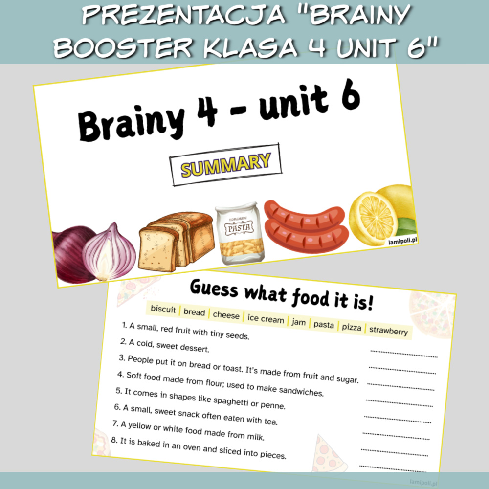 Zestaw Brainy Booster klasa 4 Unit 6 to zbiór zadań pomagających uczniom w powtórce materiału z unitu 6 z podręcznika Brainy 4. W zestawie znajdziemy prezentację z zadaniami na słownictwo, gramatykę oraz speaking, a także karty pracy, które można wykorzystać jako alternatywny test lub jako coś dla early finishers. Brainy Booster klasa 4 Unit 6 to idealna pomoc dla korepetytorów, rodziców oraz dla nauczycieli, którzy chcą dodatkowo przećwiczyć z uczniami zagadnienia z danego unitu.