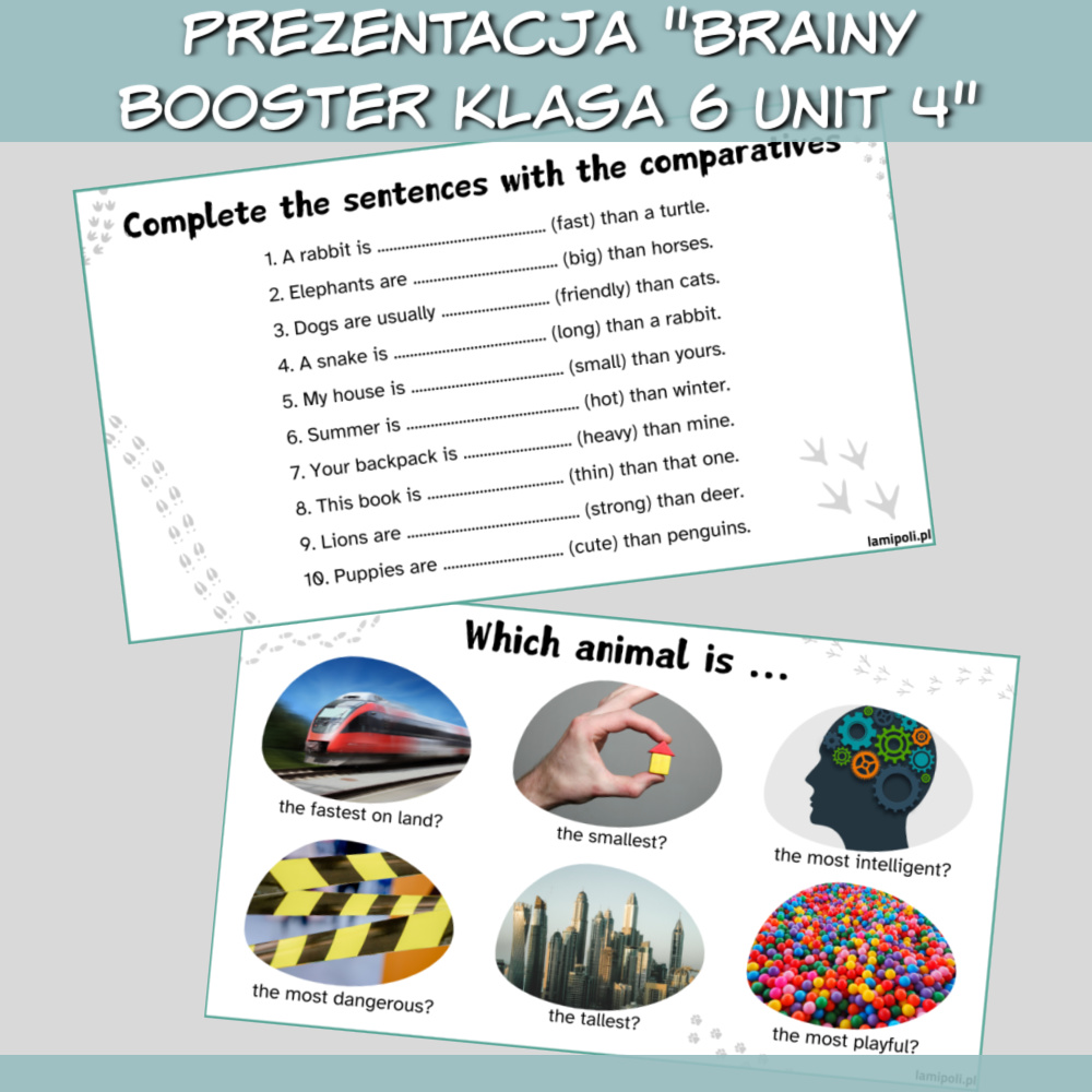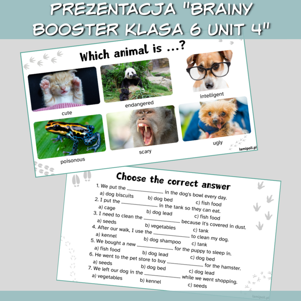 prezentację w formacie PDF składającą się z 15 slajdów, w tym 13 slajdów z zadaniami sprawdzającymi znajomość gramatyki oraz słownictwa z Brainy 6 Unit 4 oraz z zadaniami na tematyczny speaking,