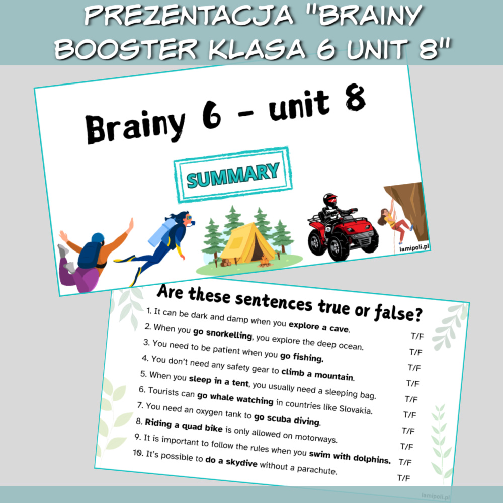 Zestaw Brainy Booster klasa 6 Unit 8 to zbiór zadań pomagających uczniom w powtórce materiału z unitu 8 z podręcznika Brainy 6. W zestawie znajdziemy prezentację z zadaniami na słownictwo, gramatykę oraz speaking, a także karty pracy, które można wykorzystać jako alternatywny test lub jako coś dla early finishers. Brainy Booster klasa 6 Unit 8 to idealna pomoc dla korepetytorów, rodziców oraz dla nauczycieli, którzy chcą dodatkowo przećwiczyć z uczniami zagadnienia z danego unitu.