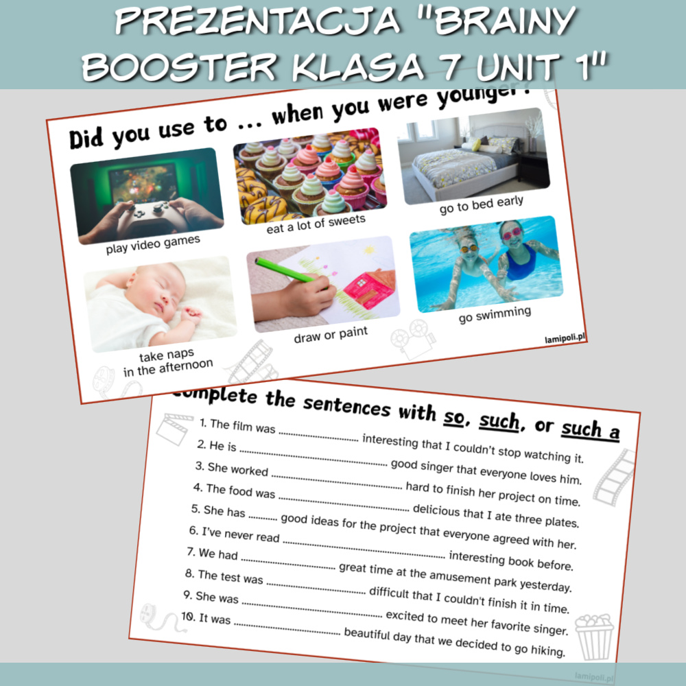 Nie trać czasu na tworzenie dodatkowych ćwiczeń – z Zestawem Brainy Booster klasa 7 Unit 1 masz wszystko, czego potrzebujesz, by przeprowadzić profesjonalne, angażujące lekcje.