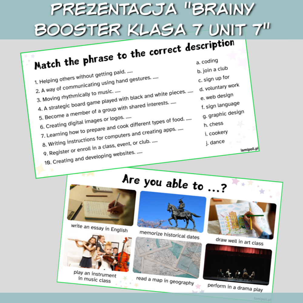 Nie trać czasu na tworzenie dodatkowych ćwiczeń – z Zestawem Brainy Booster klasa 7 Unit 7 masz wszystko, czego potrzebujesz, by przeprowadzić profesjonalne, angażujące lekcje.