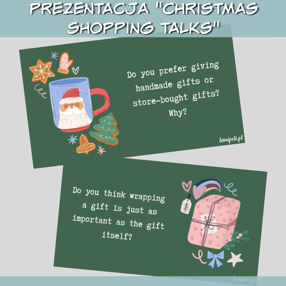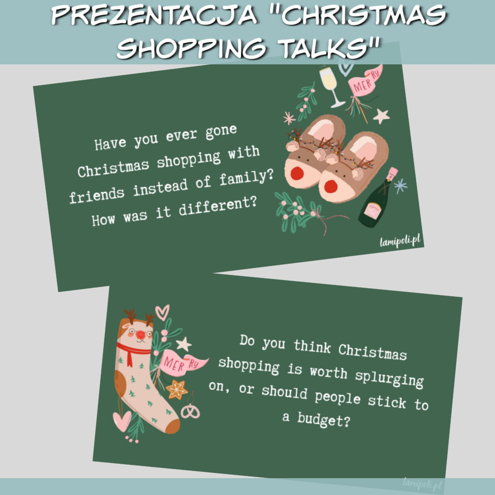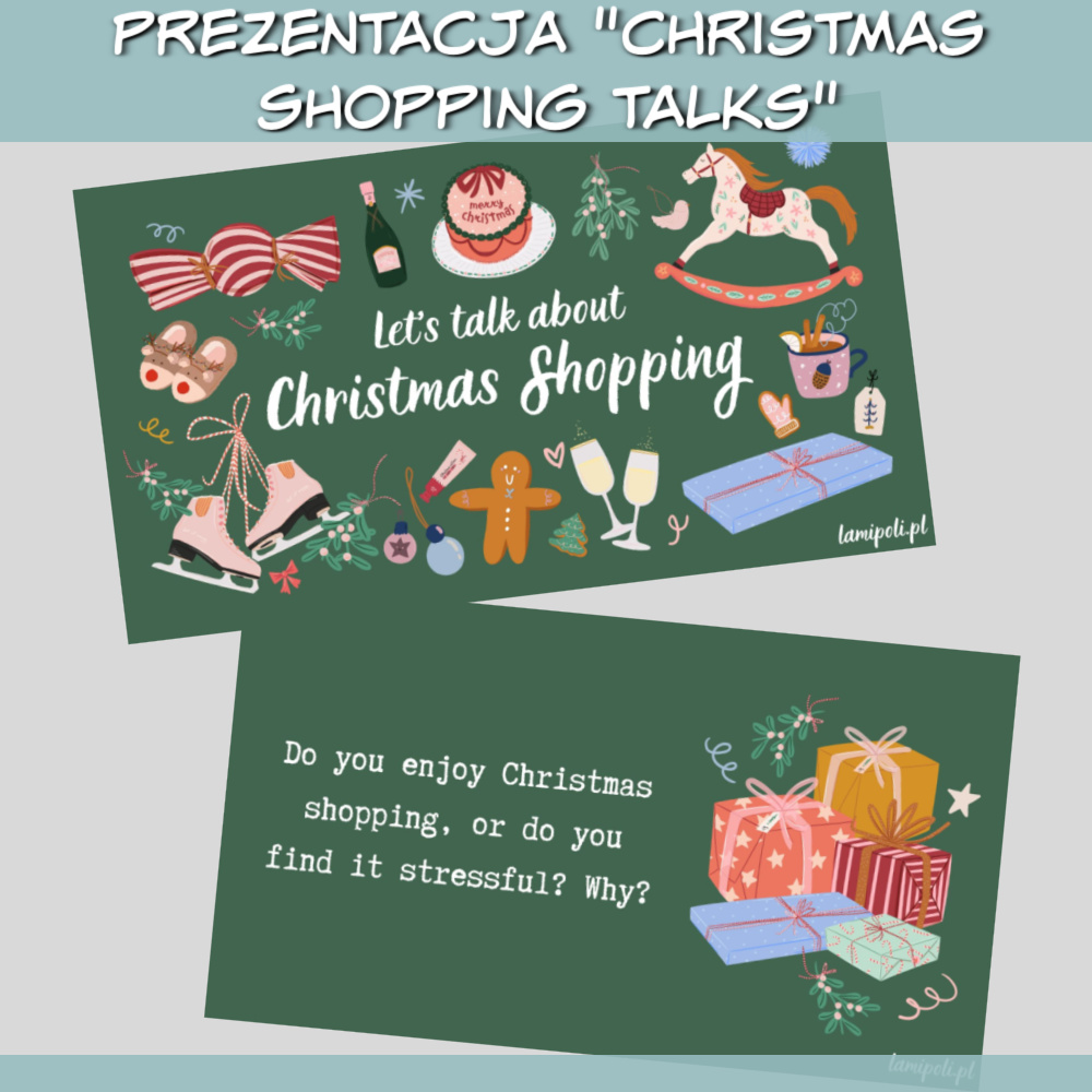 Zestaw Christmas Shopping Talks to kreatywna prezentacja stworzona z myślą o lekcjach angielskiego, która doskonale sprawdzi się zarówno w pracy z młodzieżą, jak i dorosłymi. Dzięki pytaniom które zawiera Zestaw Christmas Shopping Talks dotyczącym świątecznych zakupów i zimowym grafikom Twoje lekcje nabiorą magicznego, świątecznego klimatu.
