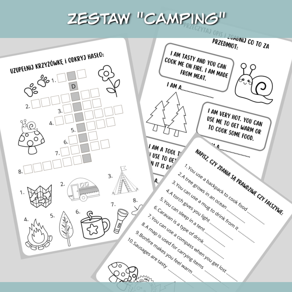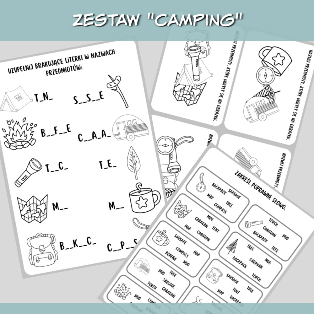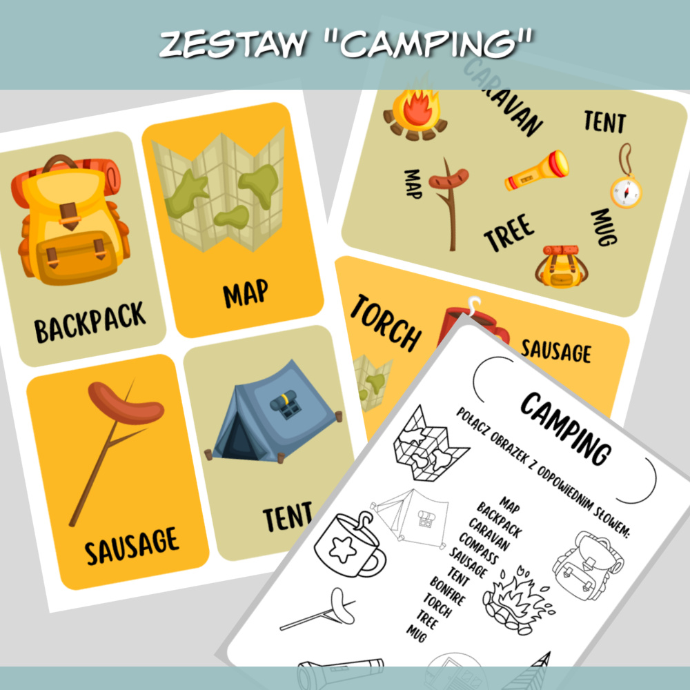 Zestaw do druku Camping to zbiór kart pracy, gier oraz flashcards na zajęcia języka angielskiego z dziećmi w temacie kempingu. W zestawie do druku Camping znajdziemy materiały do nauki dziesięciu słów związanych z kempingiem: map, backpack, caravan, compass, sausage, tent, bonfire, torch, tree, mug.