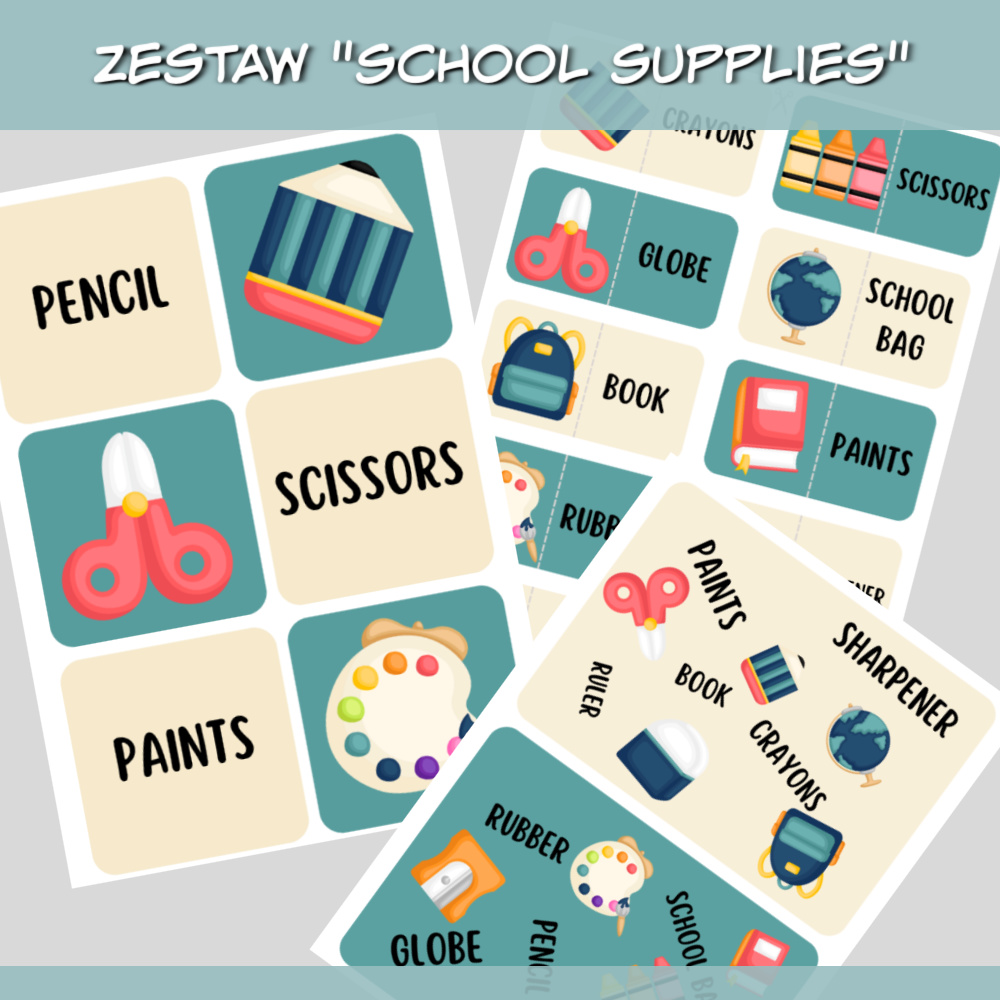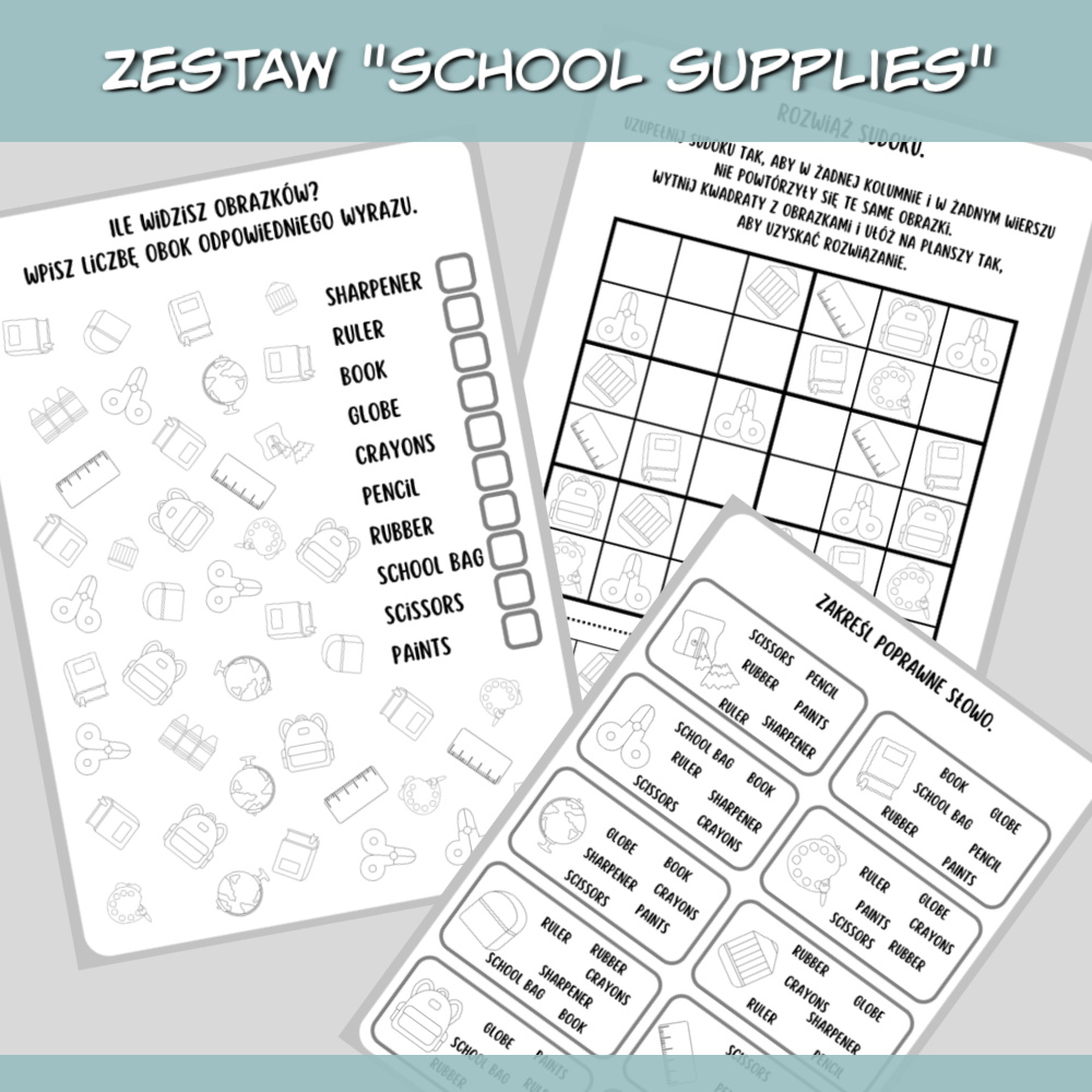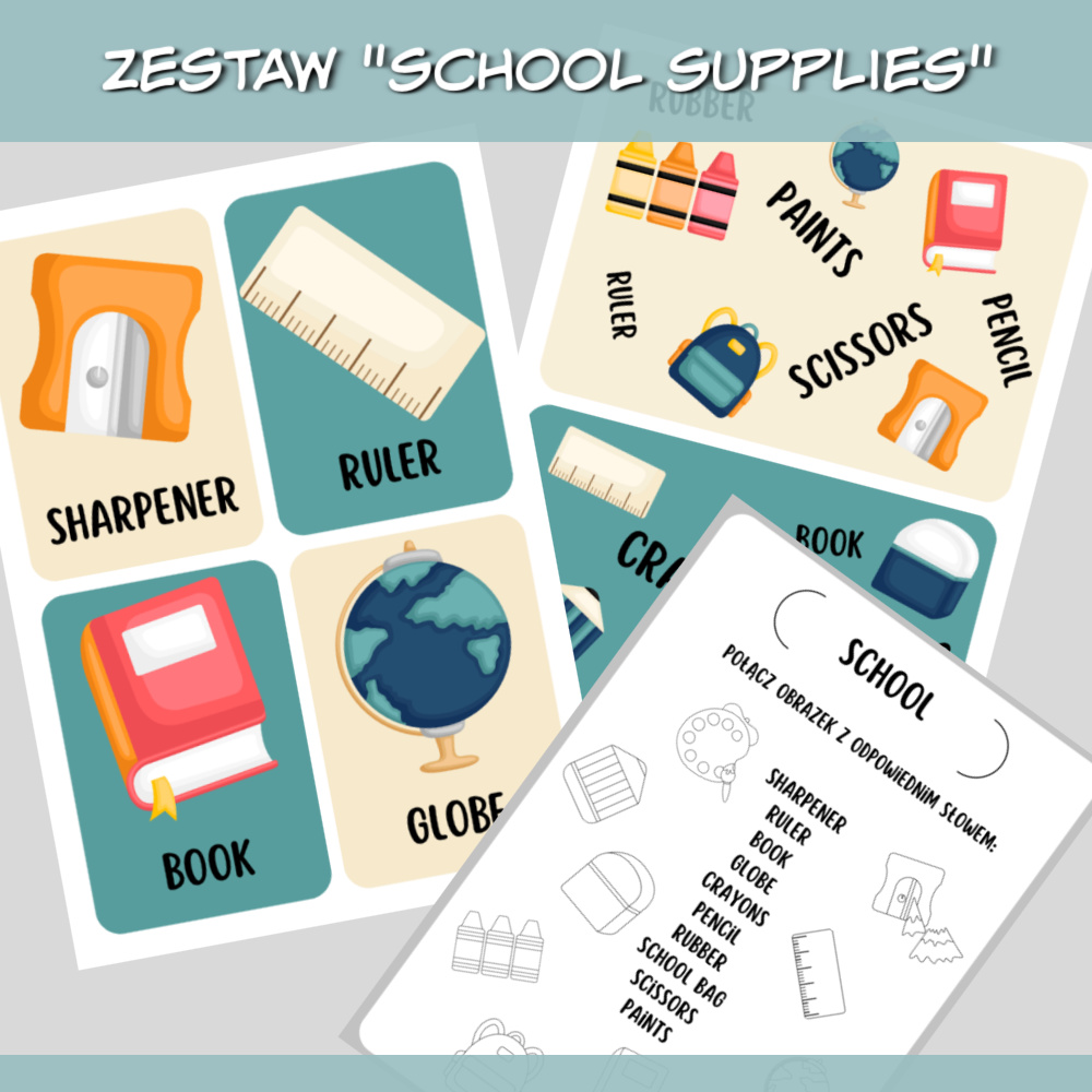 Zestaw do druku School Supplies to zbiór kart pracy, gier oraz flashcards na zajęcia języka angielskiego z dziećmi w temacie przyborów szkolnych. W zestawie znajdziemy materiały do nauki dziesięciu słów związanych z przyborami szkolnymi: sharpener, ruler, book, globe, crayons, pencil, rubber, school bag, scissors, paints.