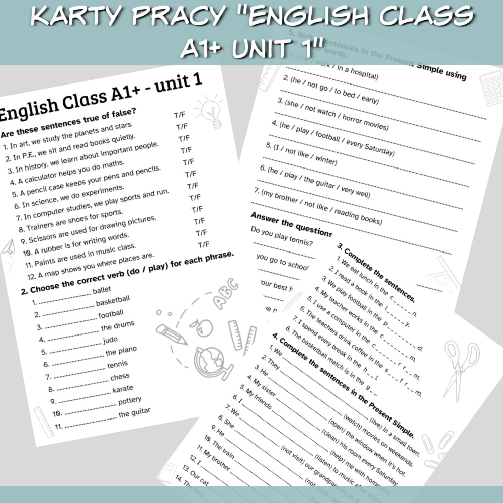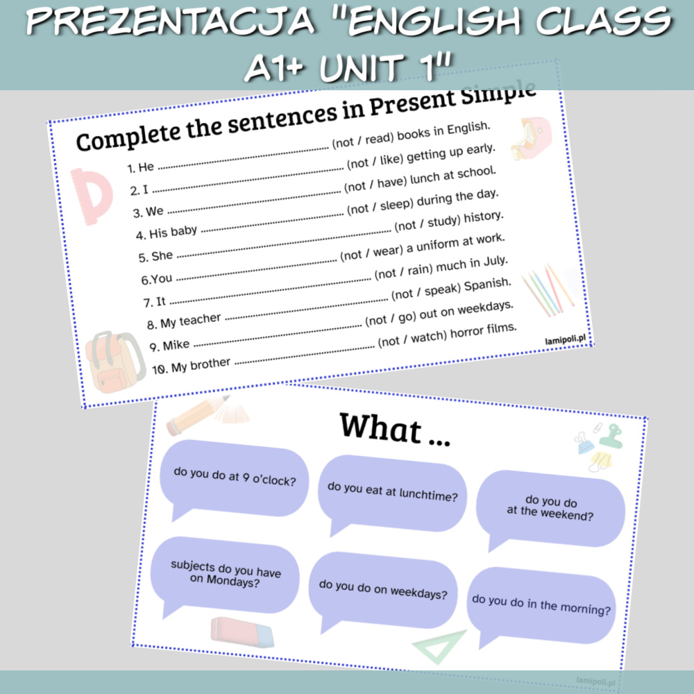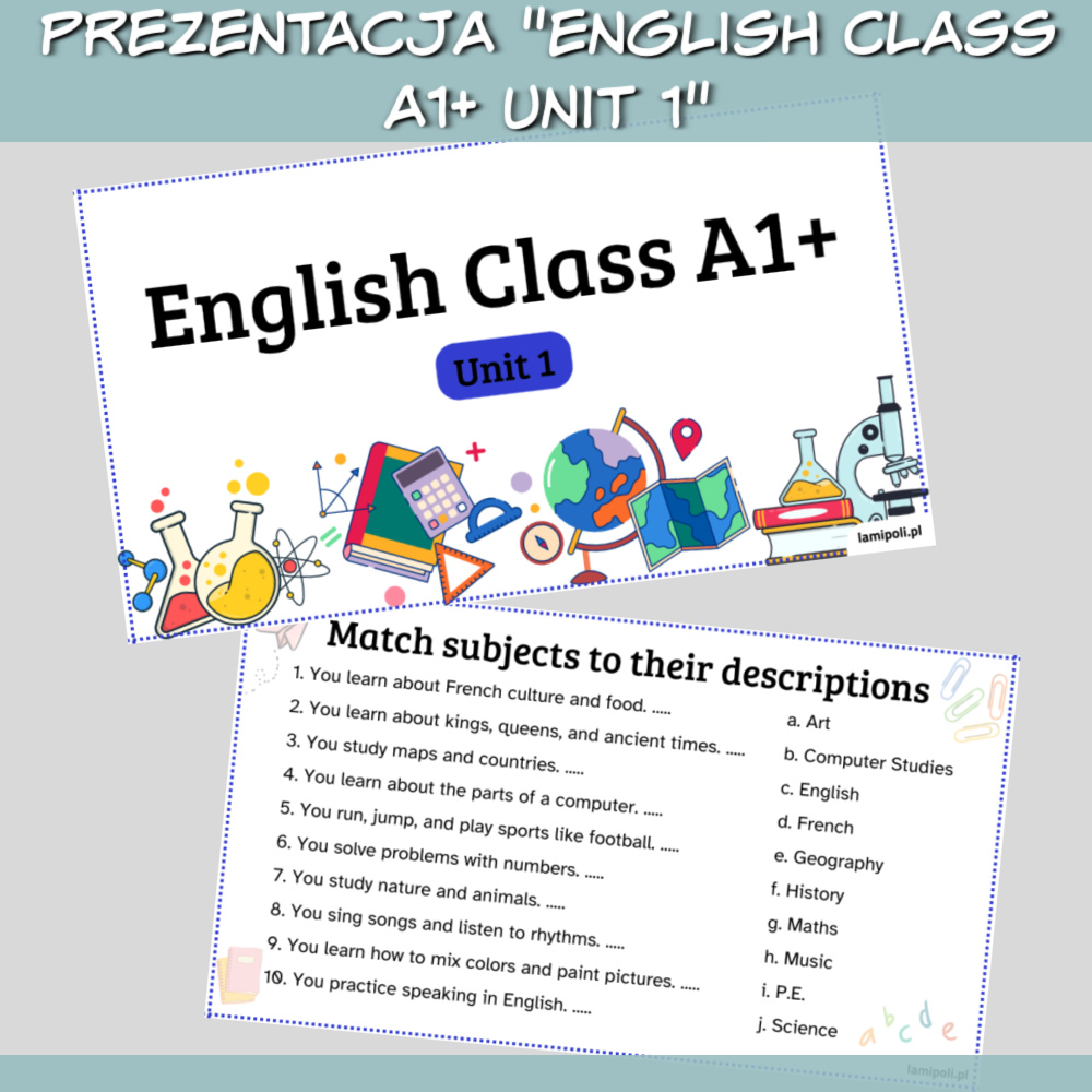 Zestaw English Class A1+ Unit 1 to zbiór zadań pomagających uczniom w powtórce materiału z unitu 1 z podręcznika English Class A1+. W zestawie znajdziemy prezentację z zadaniami na słownictwo, gramatykę oraz speaking, a także karty pracy, które można wykorzystać jako alternatywny test lub jako coś dla early finishers. Zestaw English Class A1+ Unit 1 to idealna pomoc dla korepetytorów, rodziców oraz dla nauczycieli, którzy chcą dodatkowo przećwiczyć z uczniami zagadnienia z danego unitu.