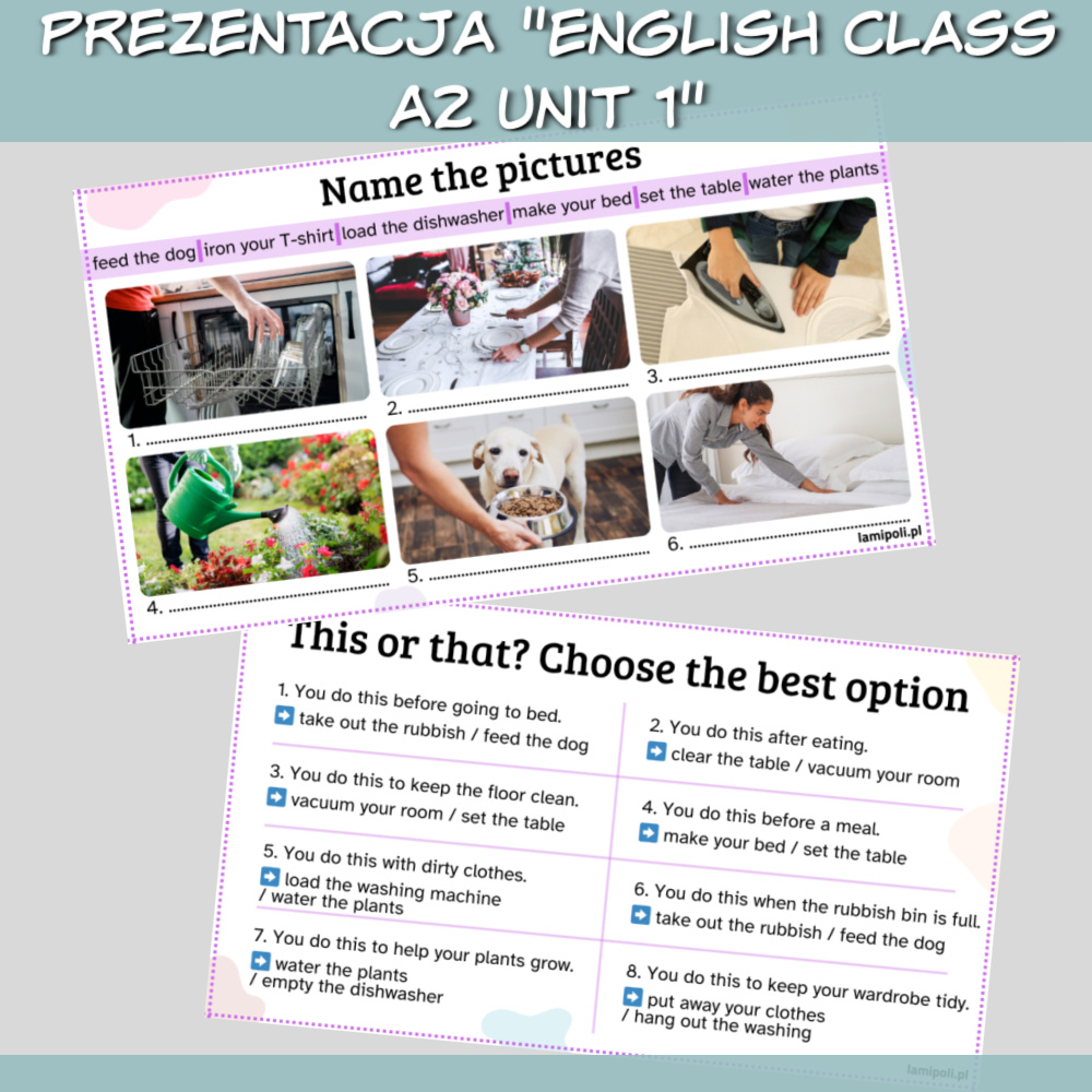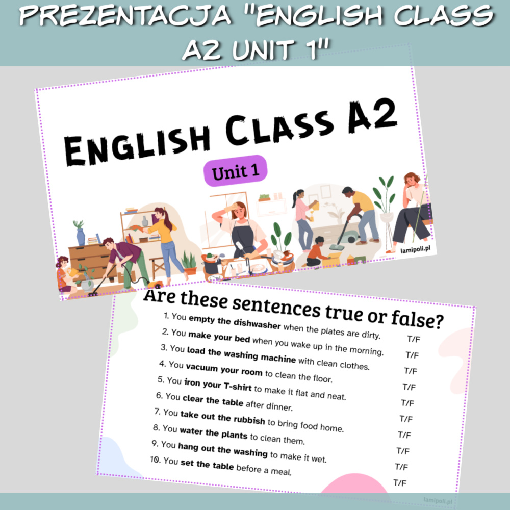 Zestaw English Class A2 Unit 1 to zbiór zadań pomagających uczniom w powtórce materiału z unitu 1 z podręcznika English Class A2. W zestawie znajdziemy prezentację z zadaniami na słownictwo, gramatykę oraz speaking, a także karty pracy, które można wykorzystać jako alternatywny test lub jako coś dla early finishers. Zestaw English Class A2 Unit 1 to idealna pomoc dla korepetytorów, rodziców oraz dla nauczycieli, którzy chcą dodatkowo przećwiczyć z uczniami zagadnienia z danego unitu.