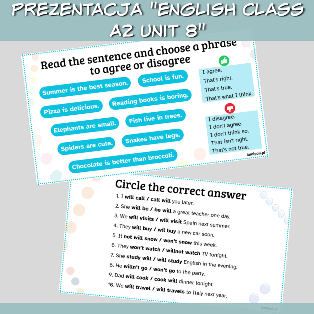 Zestaw English Class A2 Unit 8 to zbiór zadań pomagających uczniom w powtórce materiału z unitu 8 z podręcznika English Class A2. W zestawie znajdziemy prezentację z zadaniami na słownictwo, gramatykę oraz speaking, a także karty pracy, które można wykorzystać jako alternatywny test lub jako coś dla early finishers. Zestaw English Class A2 Unit 8 to idealna pomoc dla korepetytorów, rodziców oraz dla nauczycieli, którzy chcą dodatkowo przećwiczyć z uczniami zagadnienia z danego unitu.