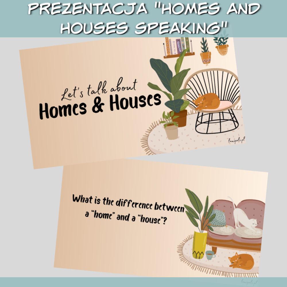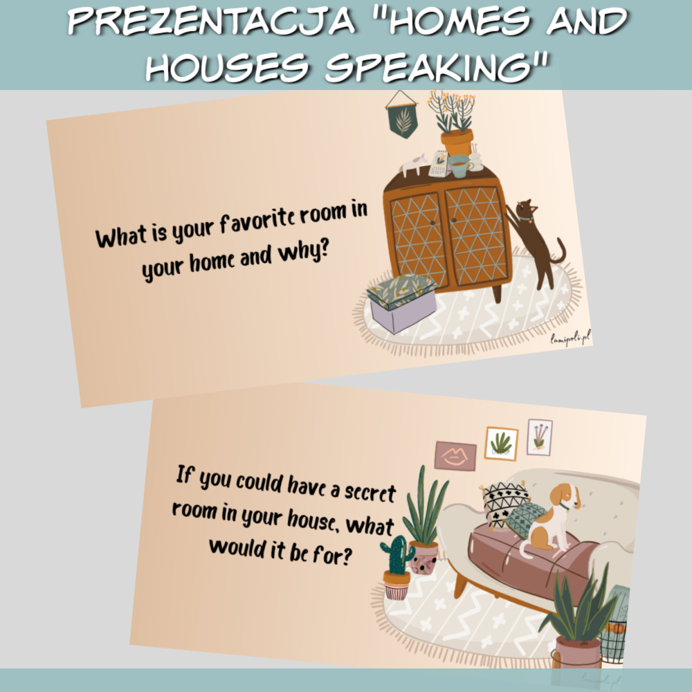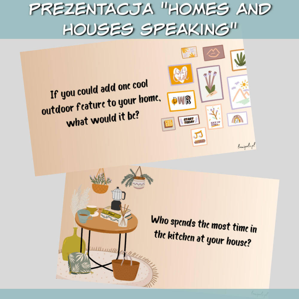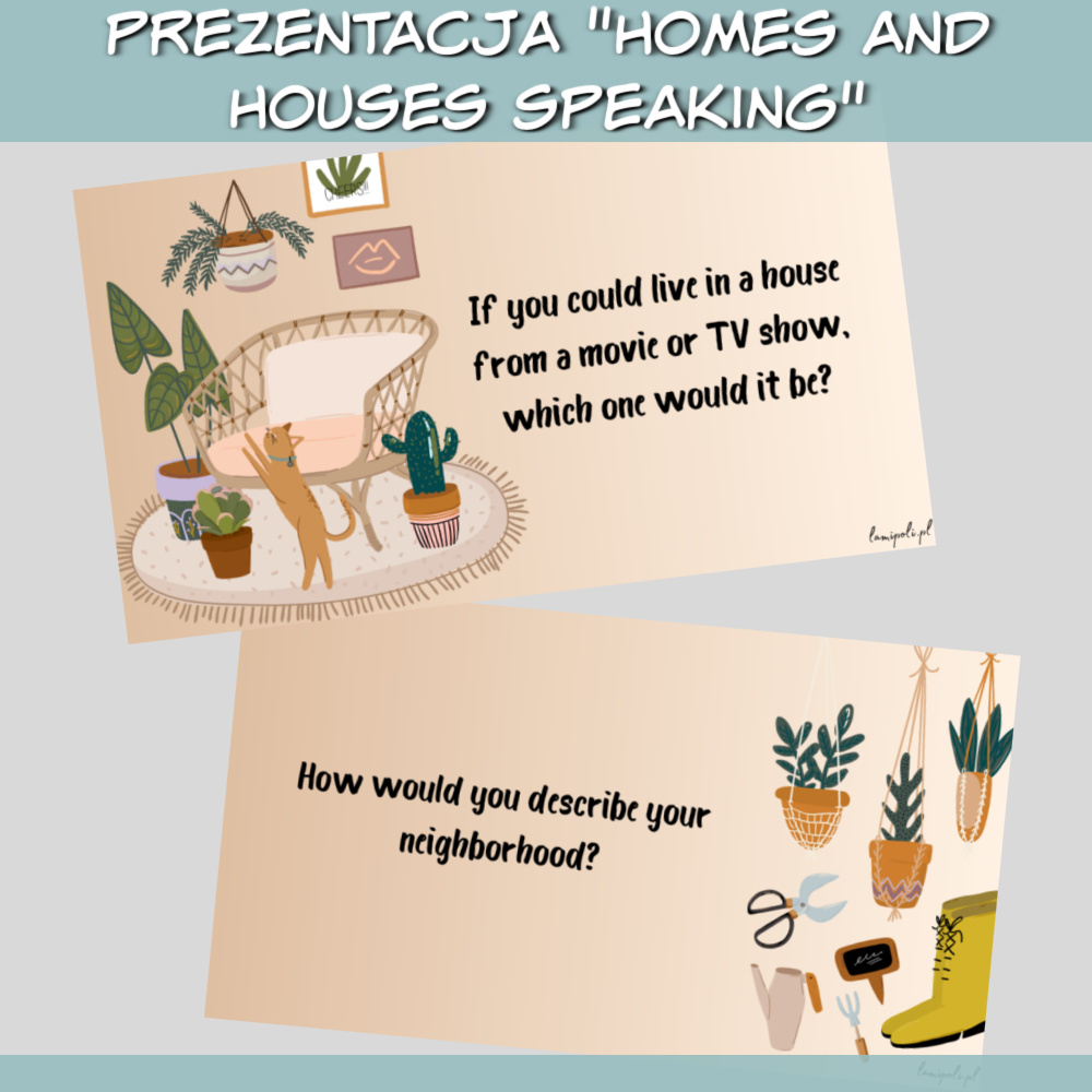 Zestaw Homes and Houses Speaking to wyjątkowa prezentacja stworzona z myślą o zajęciach z młodzieżą i dorosłymi. Dzięki różnorodnym pytaniom i estetycznym grafikom lekcje staną się ciekawsze i bardziej angażujące. Zestaw Homes and Houses Speaking doskonale łączy naukę języka angielskiego z interesującymi tematami dotyczącymi domów, mieszkań i stylów życia.
