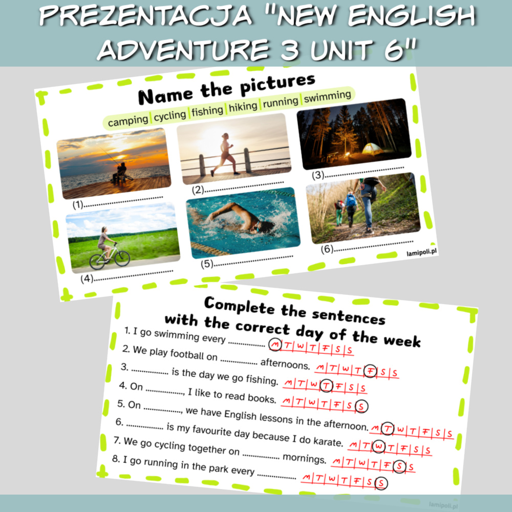 13 slajdów pełnych zadań tematycznych sprawdzających znajomość materiału z New English Adventure 3 Unit 6.