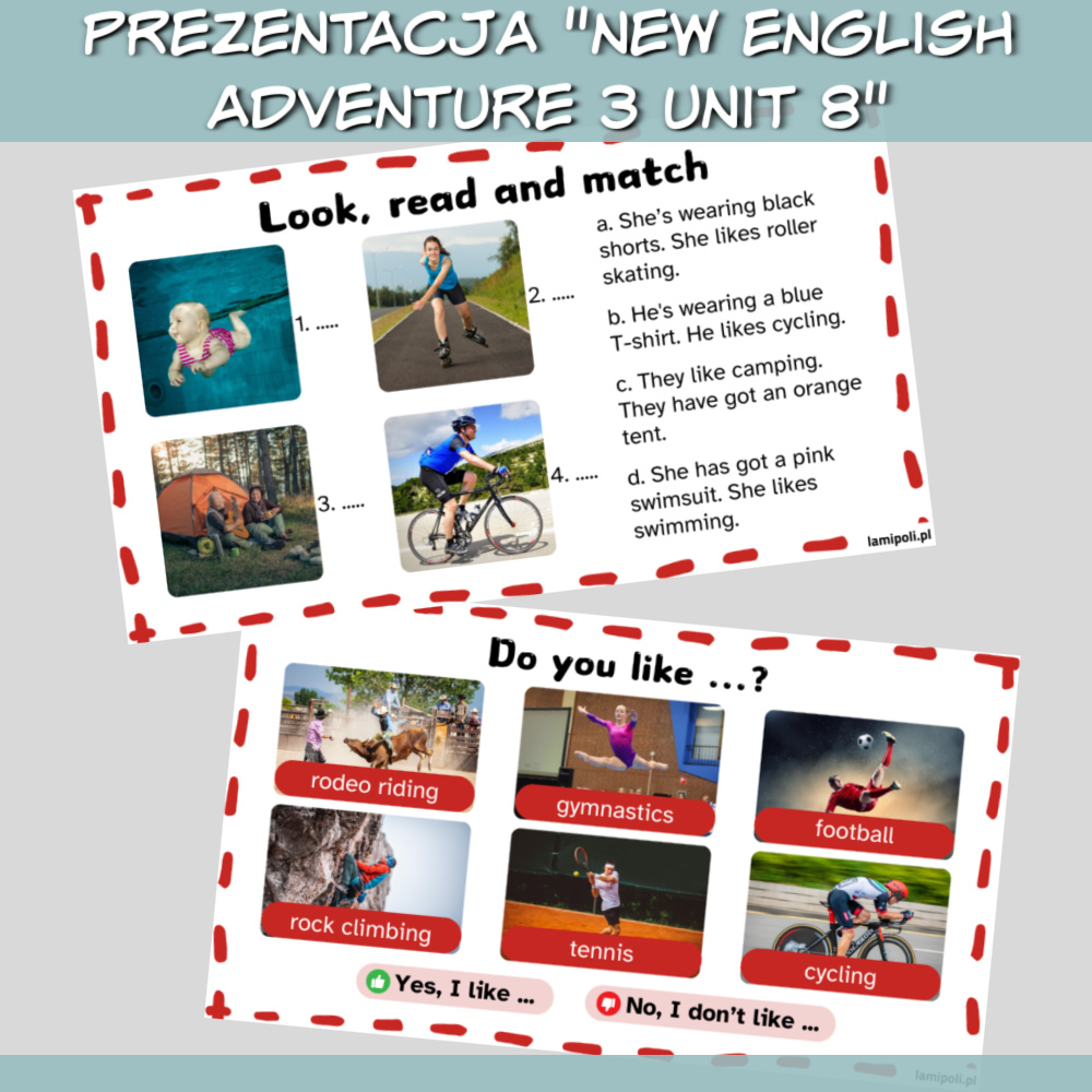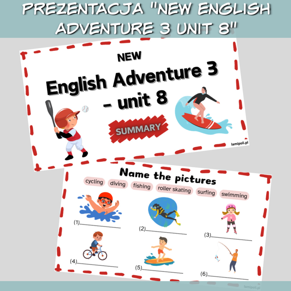 13 slajdów pełnych zadań tematycznych sprawdzających znajomość materiału z New English Adventure 3 Unit 8.